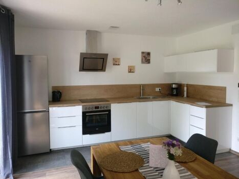 Cerankochfeld, Induktionsherd, Dunstabzugshaube, Eierkocher, Geschirrhandtücher, Mülltüten, Essplatz in der Küche, TV in der Küche