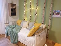 Das Schlafzimmer verfügt über ein großes Boxspringbett (1,80m x 2,00m), das problemlos geteilt werden kann. Gerne stellen wir ein Baby-Bett zur Verfügung. Doppelbett 1,80 x 2,00m, Boxspringbett, Kommode, Spiegel, Leselampe am Bett, Fliegengitter