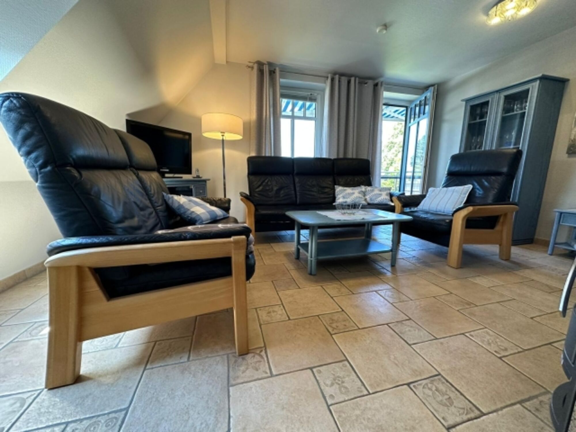 TV-Sat, TV-Flachbildschirm, Kaminofen, 3er-Sofa, 2er-Sofa, Sessel, Fliegengitter