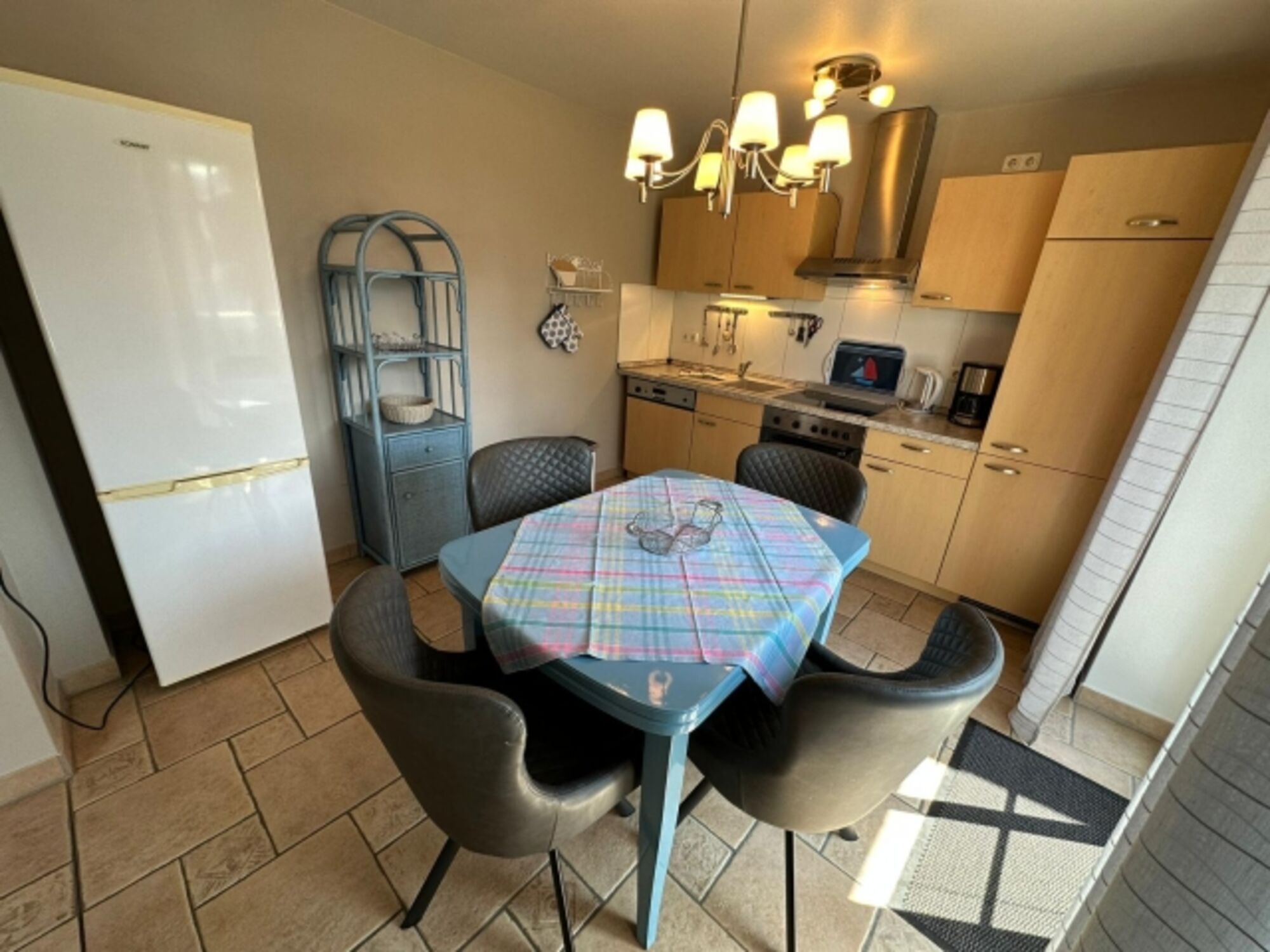 4-Platten Herd, Cerankochfeld, Dunstabzugshaube, Gefrierschrank, Senseo-Kaffeeautomat, Eierkocher, Mixer, Korkenzieher / Flaschenöffner, Geschirrhandtücher, Mülltüten, Essplatz in der Küche