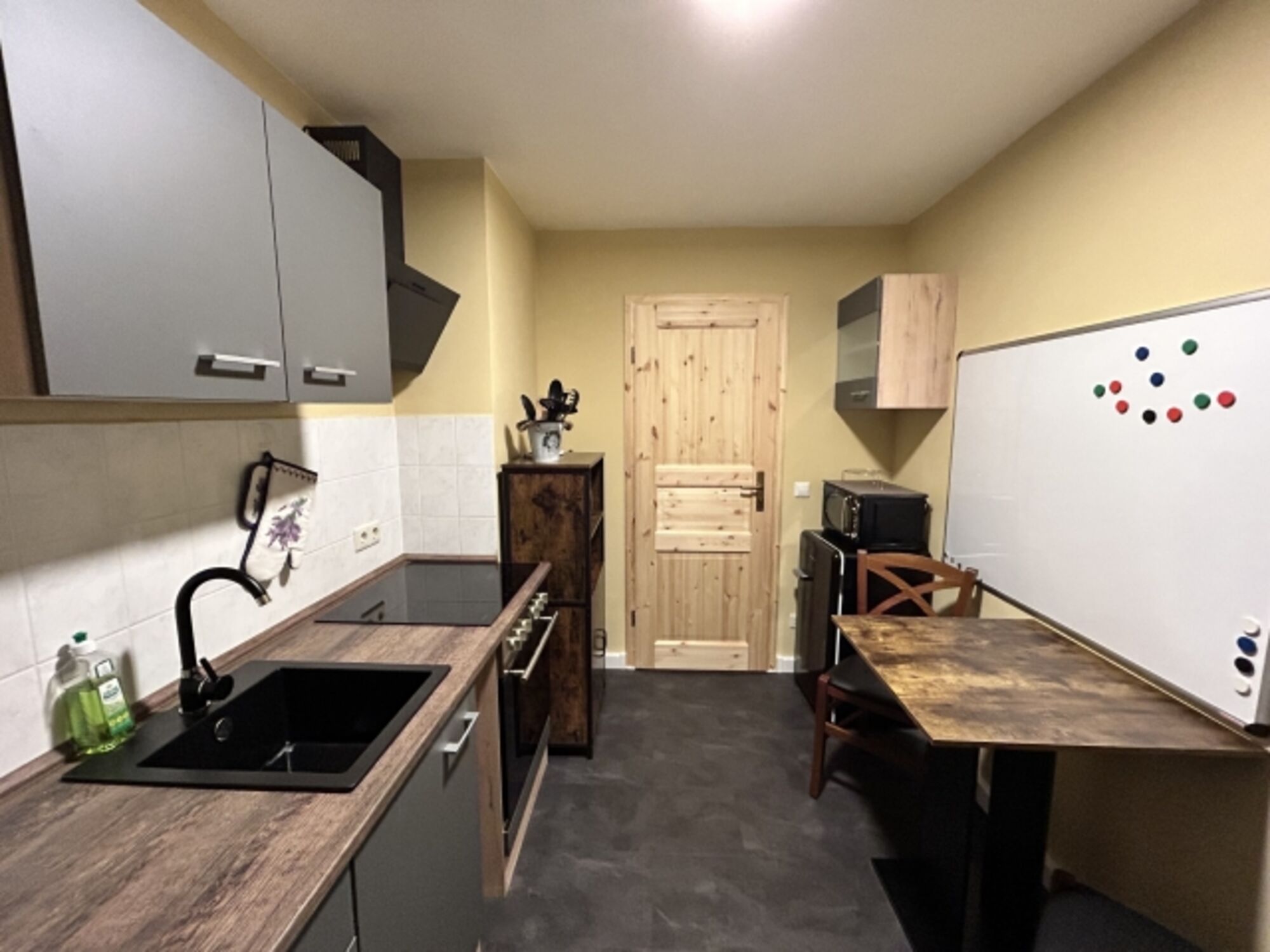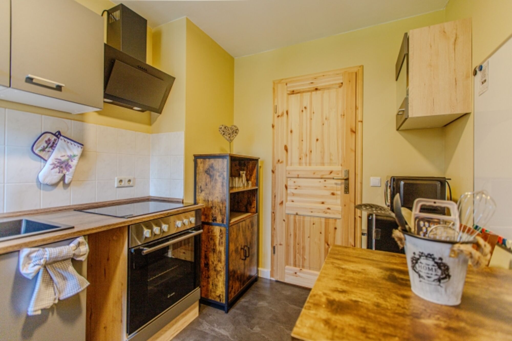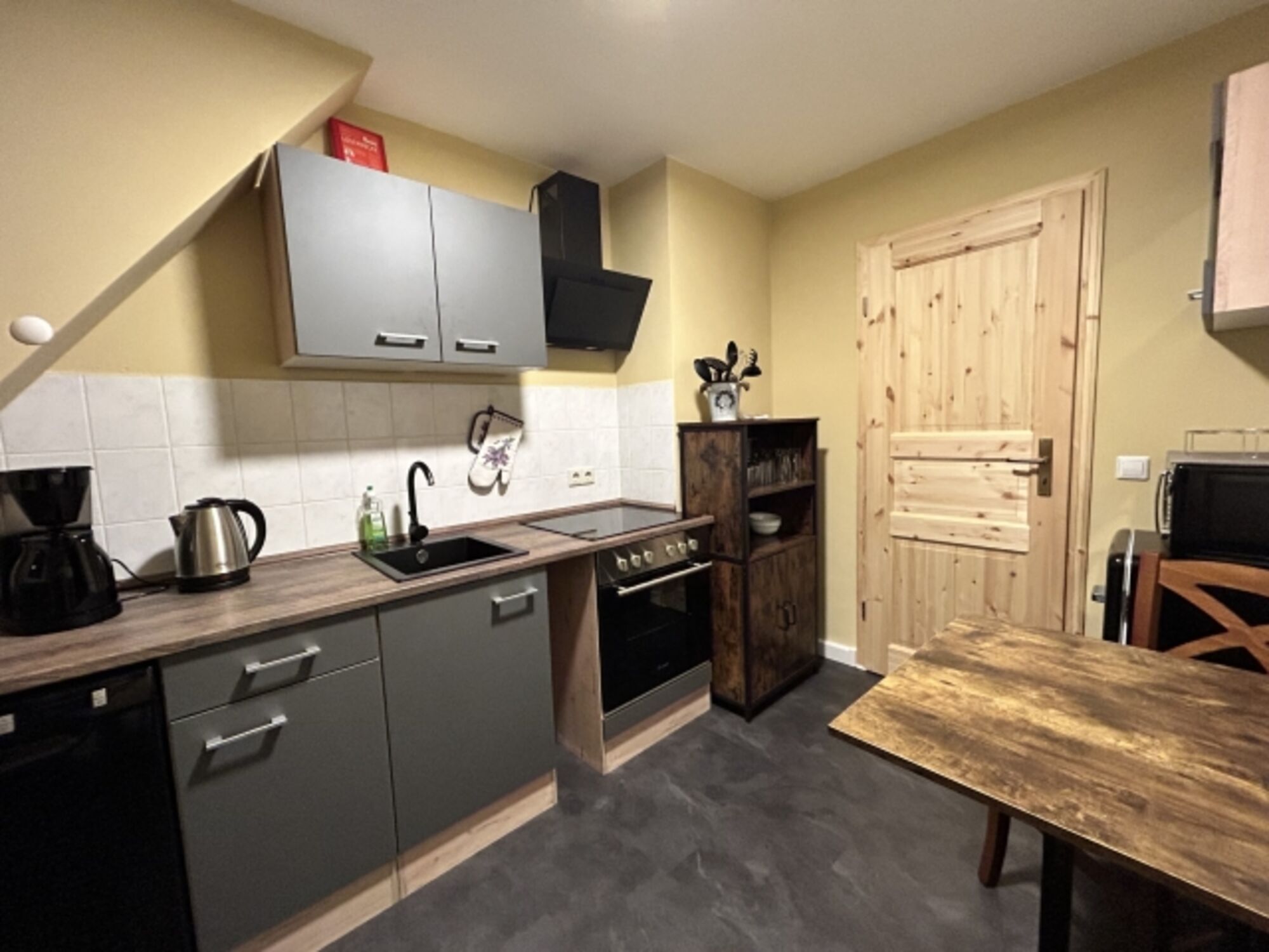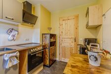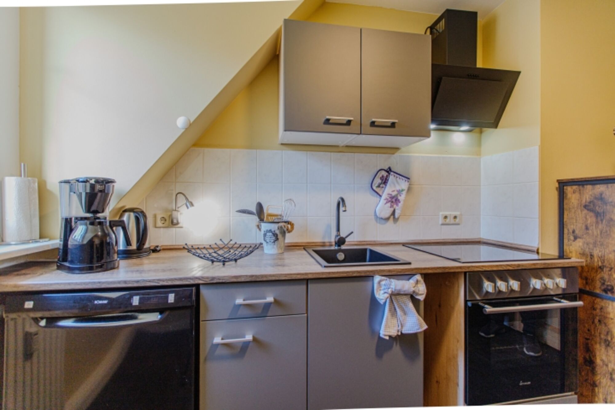 4-Platten Herd, Cerankochfeld, Dunstabzugshaube, Kühlschrank mit Gefrierfach, Eierkocher, Geschirrhandtücher, Essplatz in der Küche