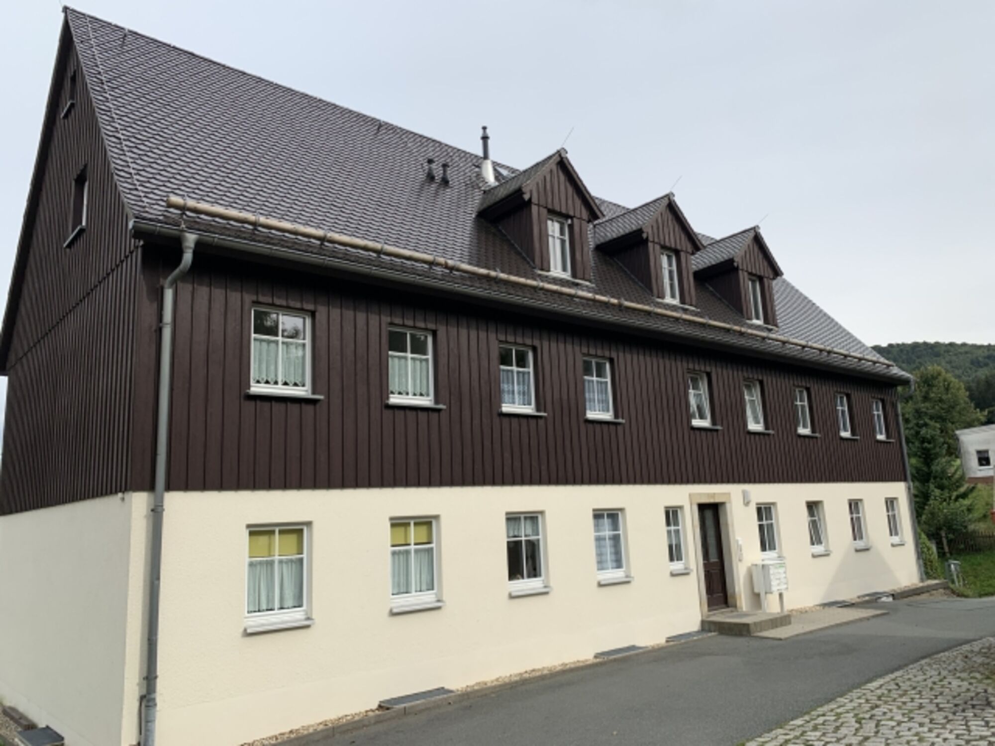 Die Ferienwohnung "Räuberhauptmann Karasek" befindet sich im Ortsteil Hain hoch oben im Gebirge, direkt auf dem Gebirgskamm des Zittauer Gebirges und nur wenige Schritte von der Deutsch-Tschechischen Grenze entfernt. Sie befindet sich im Dachgeschoss (2. Etage) eines im Jahr 1963 errichten Mehrparteienhauses. Das gesamte Objekt wurde komplett saniert und die Ferienwohnung im September 2022 vollständig neu renoviert und neu möbliert. Von der Wohnung hat man einen herausragenden Panoramablick auf das Gebirge, die umliegenden Felsformationen und den Berg Oybin mit der Burgruine,