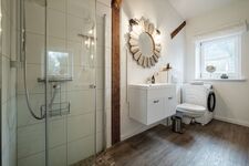 Das moderne Badezimmer verfügt über eine bodentiefe Dusche und Fußbodenheizung zum Entspannen. Hier finden Sie auch die Waschmaschine.