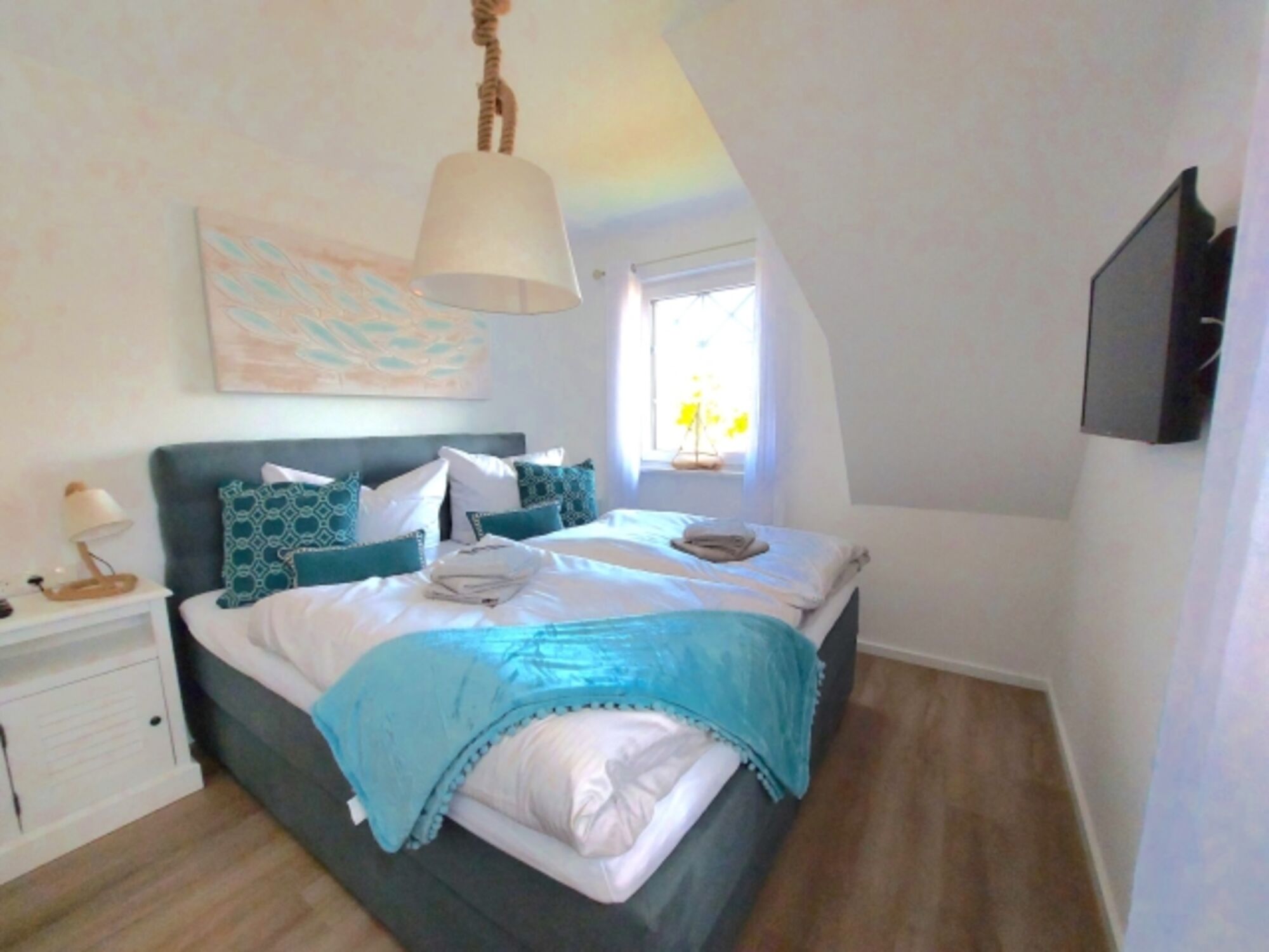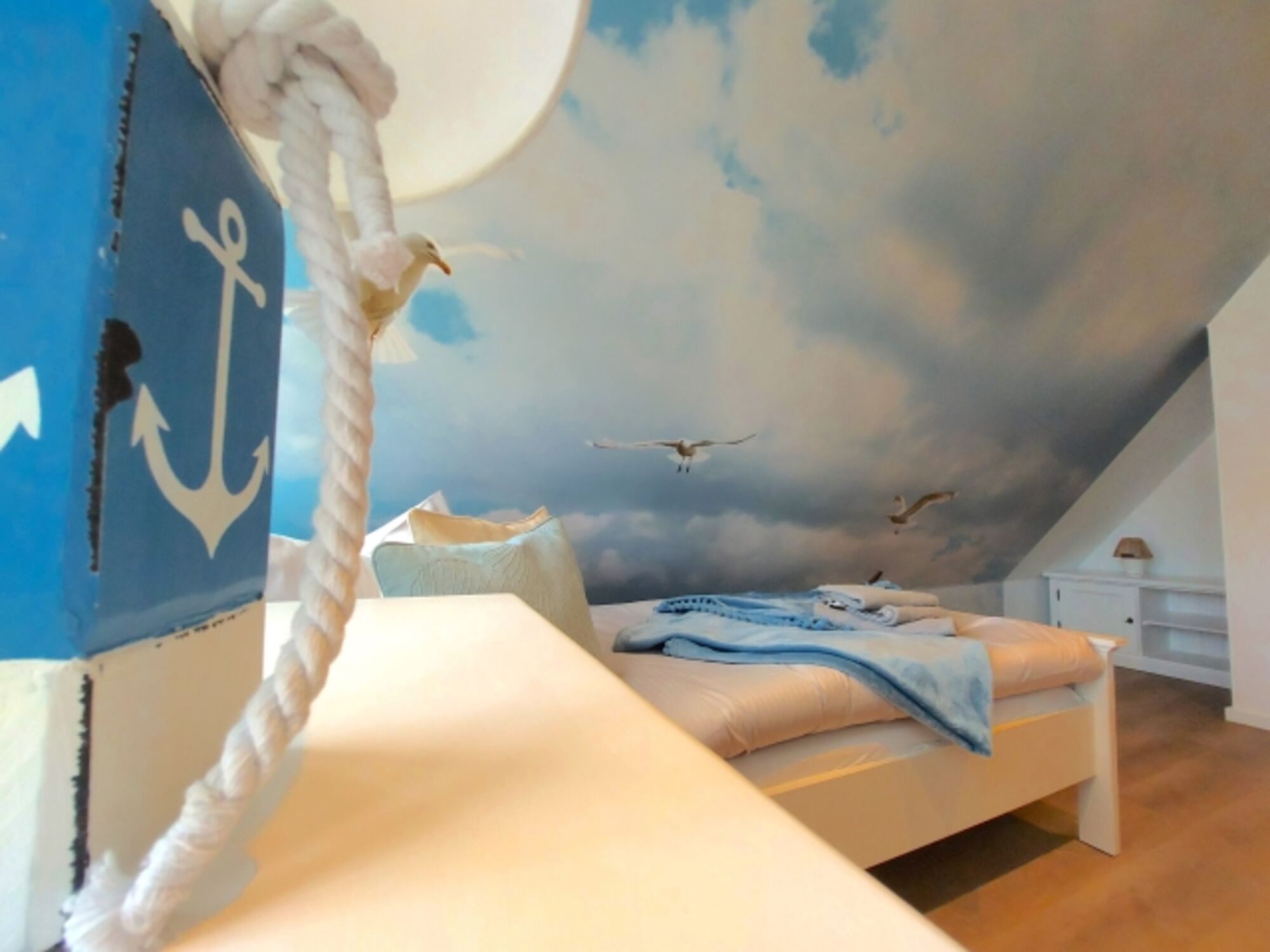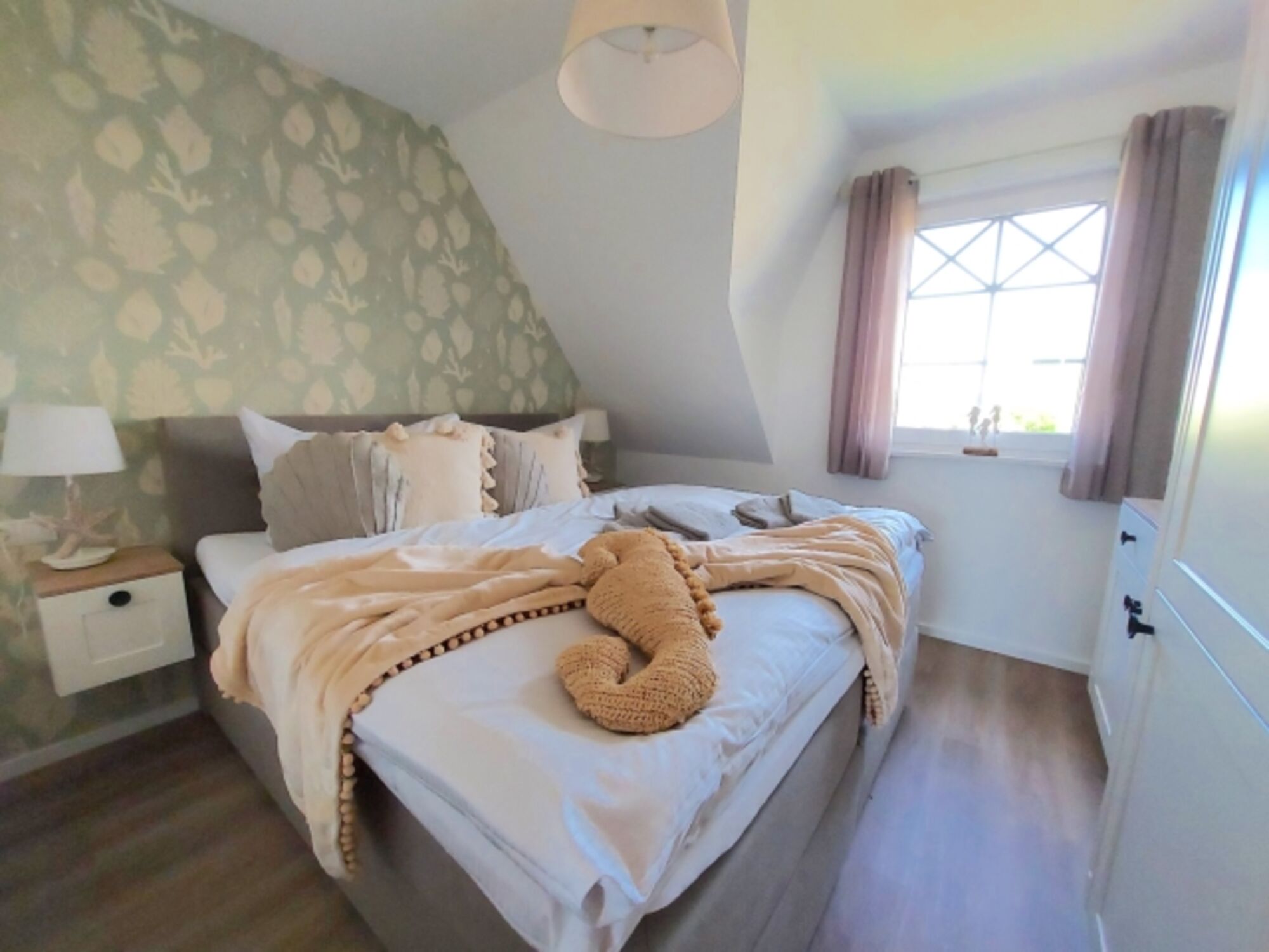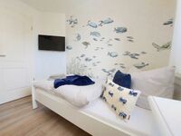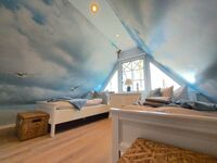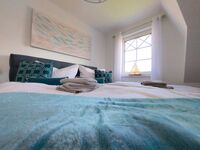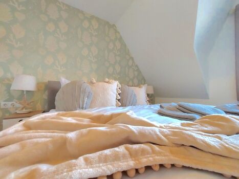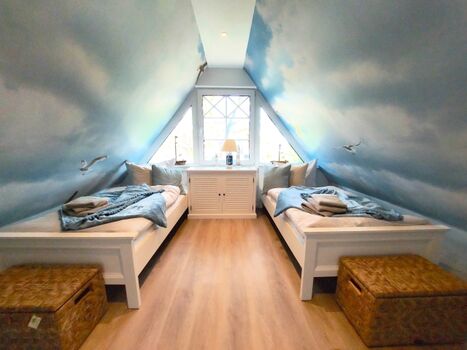 Im Obergeschoss der Ferienhaushälfte befinden sich zwei Schlafzimmer für je zwei Personen, eines der Hauptschlafzimmer hat Zugang zu einem separaten weiteren kleinen Zimmer mit Einzelbett. Die Hauptschlafzimmer sind mit einem Doppelbett ausgestattet. Das Schlafzimmer im Spitzboden verfügt über zwei Einzelbetten. Alle Schlafzimmer (ausgenommen das Schlafzimmer im Spitzboden) verfügen über einen zusätzlichen Flatscreen TV.