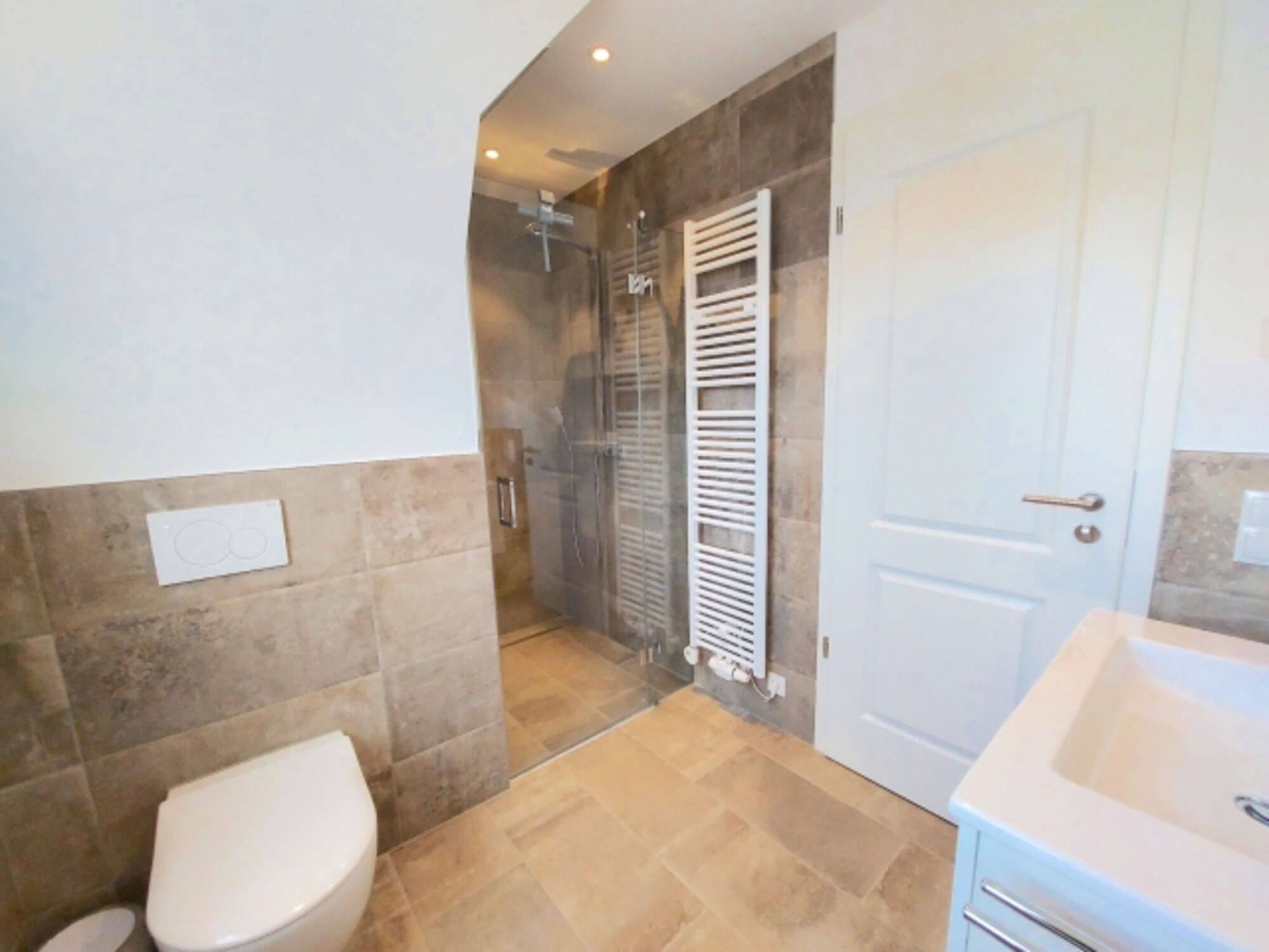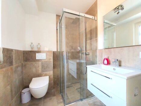 Ein Badezimmer mit Dusche, WC sowie ein Hauswirtschaftsraum mit Waschmaschine komplettieren das Erdgeschoss.