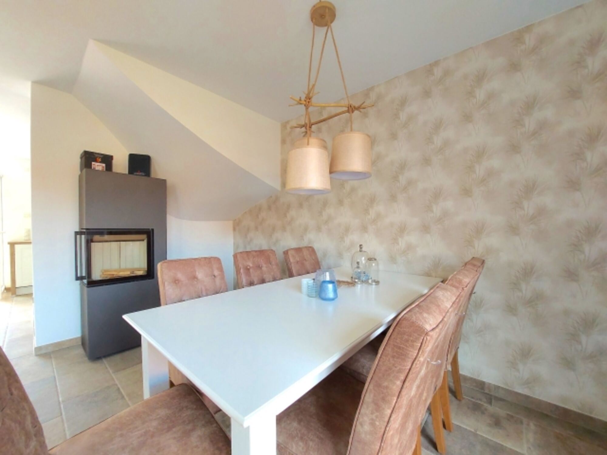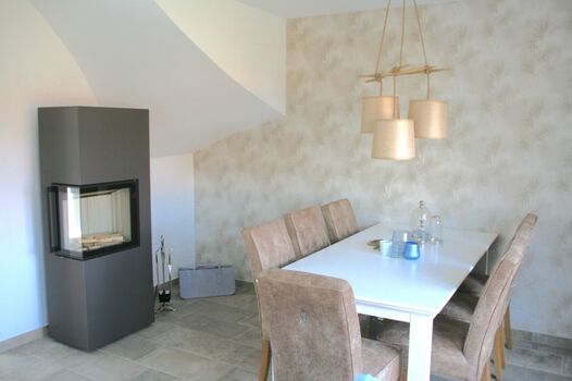 Der großzügige Wohn-Essbereich im Erdgeschoss mit offener, vollausgestatteter Küche und einem Kaminofen, lädt zum Essen und gemütlichen Beisammensein ein.
