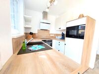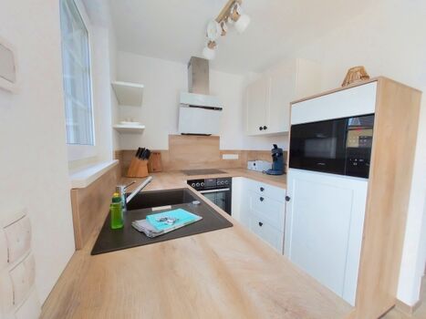 Cerankochfeld, Dunstabzugshaube, Kühlschrank mit Gefrierfach, Kaffeevollautomat, Senseo-Kaffeeautomat, Eierkocher, Küchenmaschine, Mixer, Korkenzieher / Flaschenöffner, Geschirrhandtücher, Mülltüten