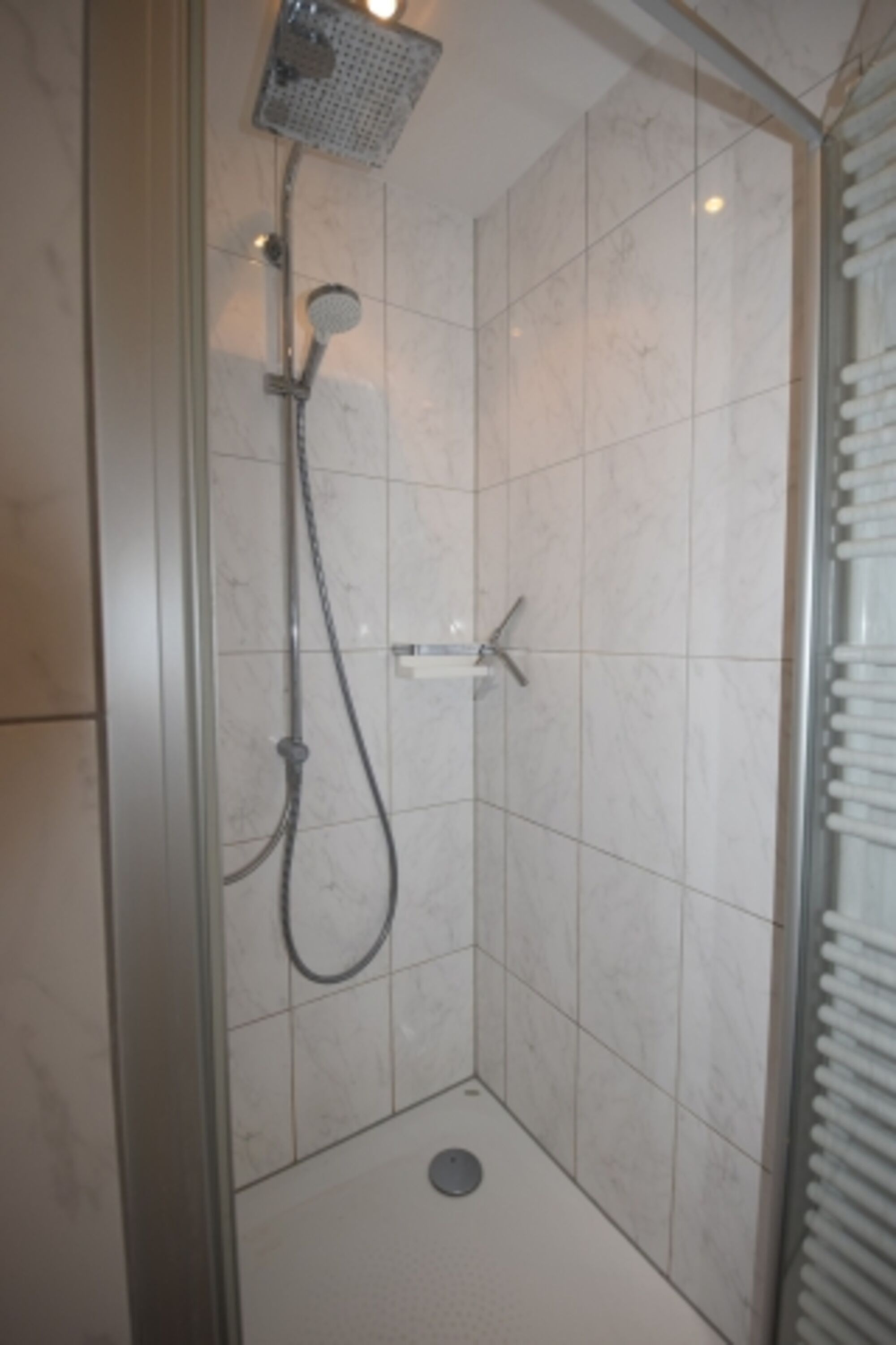Das Badezimmer mit Dusche ist gefliest und modern ausgestattet. Die Dusche ist bodentief (lediglich kleine Kante). Der Waschtisch mit großem Spiegel wird ebenso wie der Rest des Raumes von Deckenspots beleuchtet und bietet reichlich Staufläche. Ein Föhn ist hier ebenso vorhanden wie ein Handtuchwärmer, sodass das Bad keine Wünsche offenlässt.