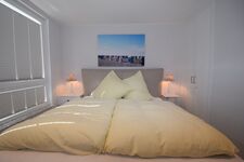 Das Schlafzimmer ist mit einem großen Doppelbett und ideal für nächtlichen Komfort eingerichtet. Ein Kleiderschrank sowie Kommoden runden die Einrichtung des Zimmers ab. In dem Schlafzimmer befindet sich zudem ein Fernseher.