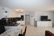 Der helle Wohnraum mit großen Fensterfronten und Zugang zum schönen Balkon teilt sich in einen Wohnbereich und die Essecke mit angrenzender Küchenzeile. Die Küche ist modern und offen gestalte. So finden sich hier neben einem Geschirrspüler auch Herd und Backofen, Kühlschrank mit Gefriermöglichkeit und zahlreiche weitere Küchenutensilien. Ein Toaster, eine Kaffeemaschine, eine Mikrowelle sowie ein Wasserkocher sind ebenfalls zu finden.