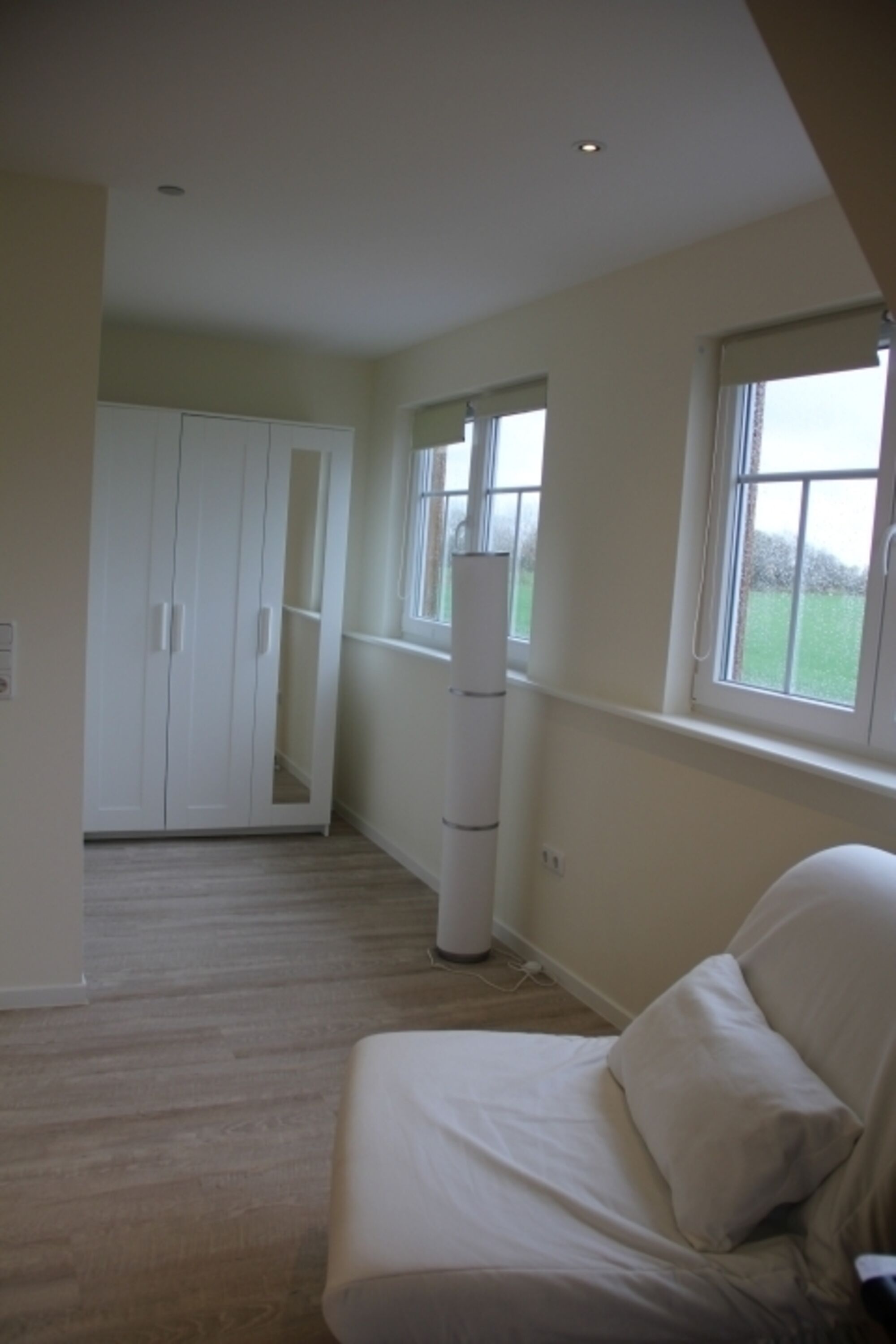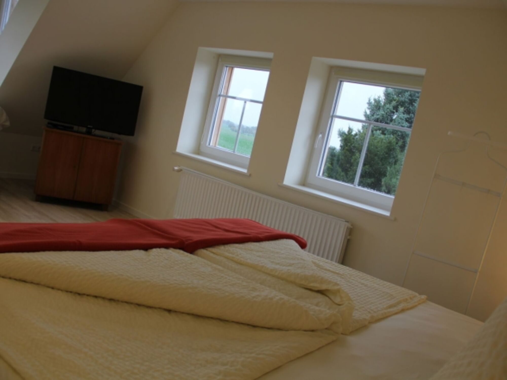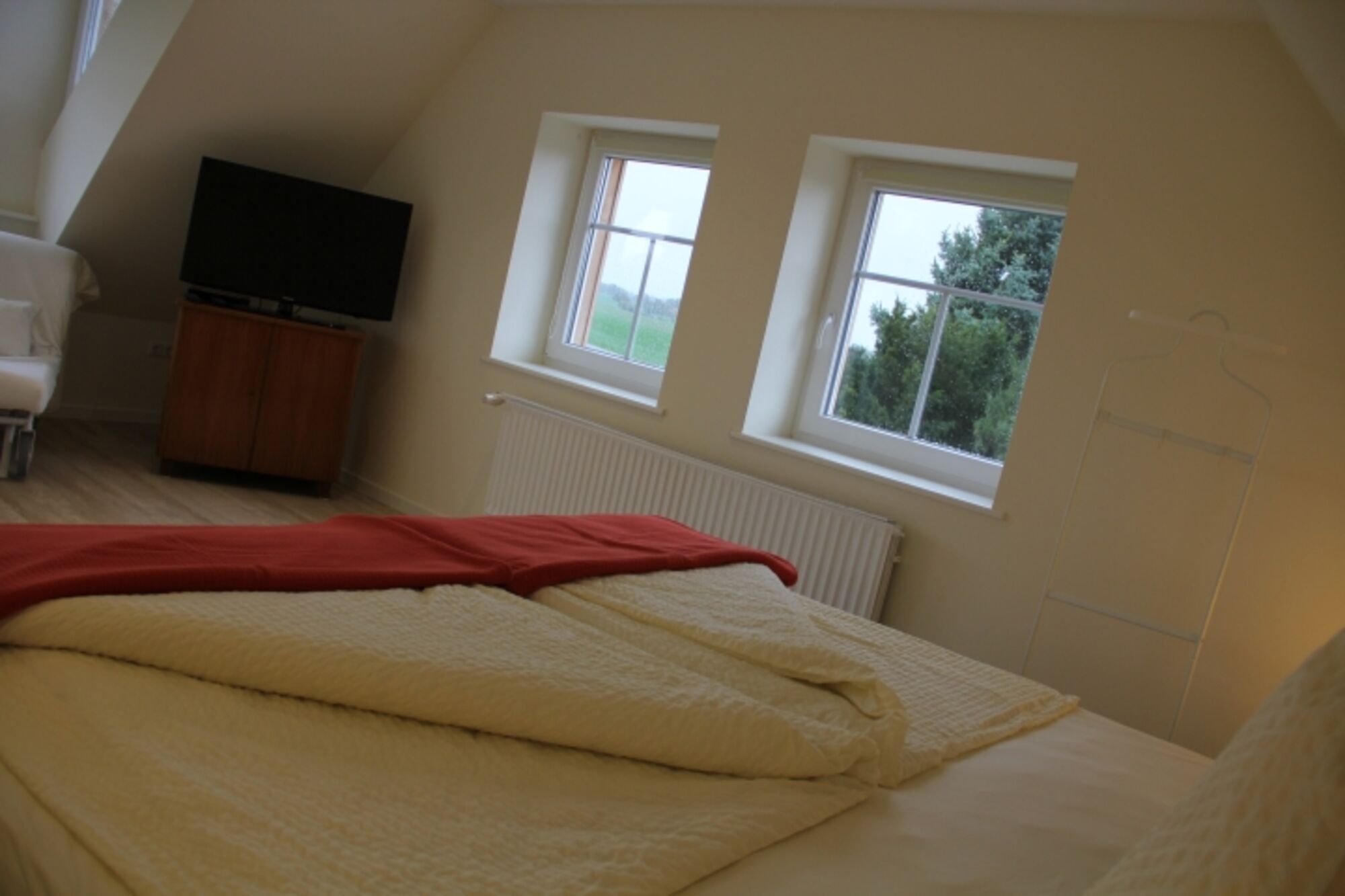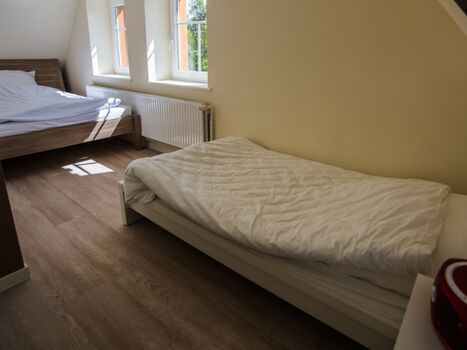 In der 1. Etage befinden sich zwei wunderschöne Schlafzimmer. Das 1. Schlafzimmer verfügt über ein Wasserbett (2 x 2 m), Tresor, Flachbildfernseher, DVD etc. und bietet einen fantastischen Blick über die angrenzenden Felder. Das 2. Schlafzimmer verfügt über ein Doppelbett (1,40 x 2 m) und ein Einzelbett (1 x 2 m) sowie ein Schreibtisch.