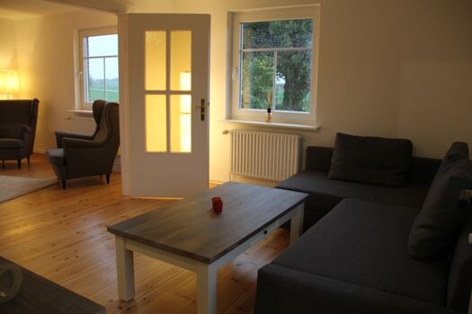 Der Wohnbereich ist in einen Essbereich mit Ofen und einer Durchreiche zur Küche, sowie einen Lesebereich mit 2 Sesseln aufgeteilt. Abgegrenzt durch eine Doppeltür können Sie auf den gemütlichen Wohnelementen (Schlafcouch) mit Echtholzfußboden entspannt Fernsehen oder Musik hören.