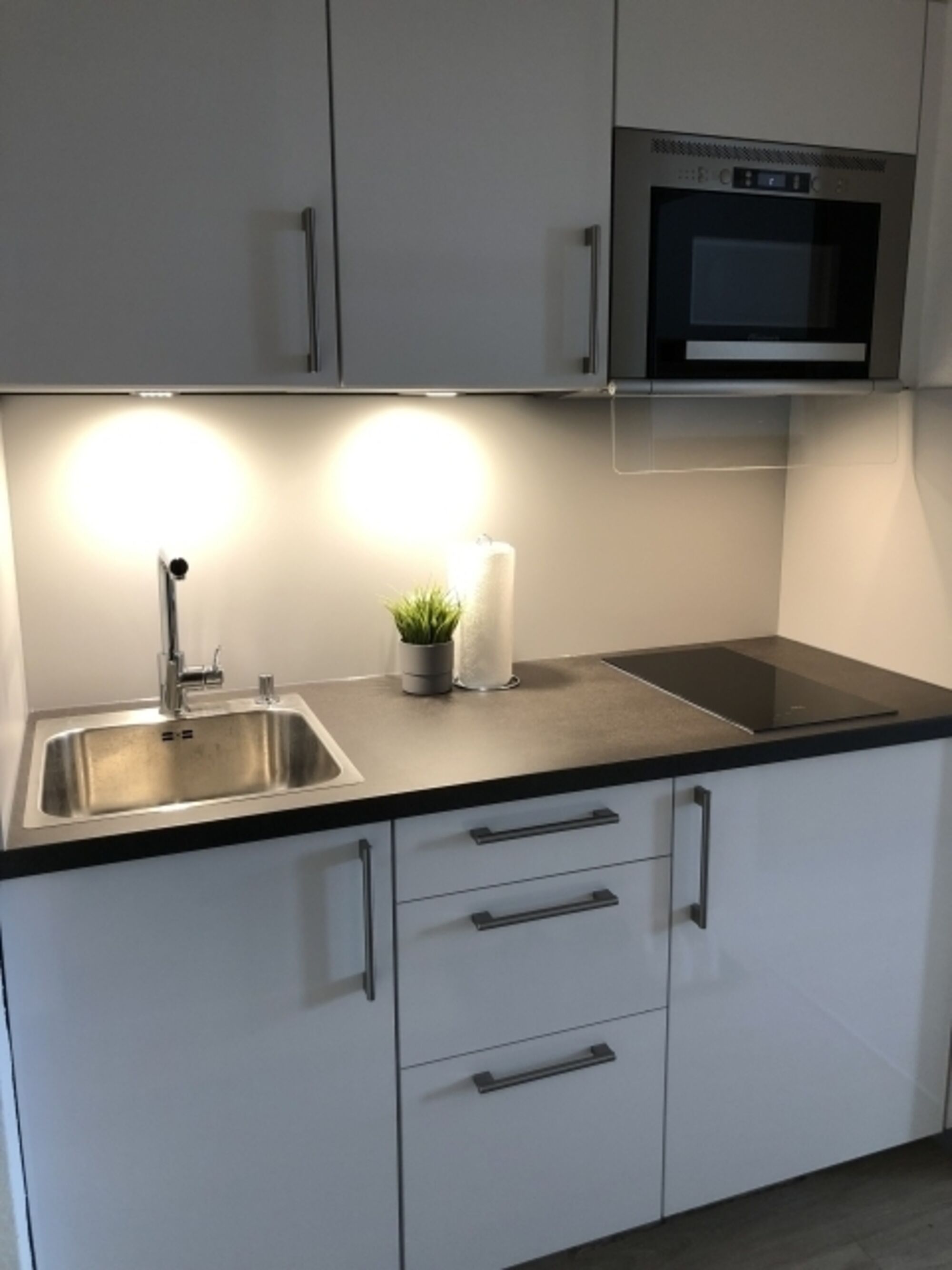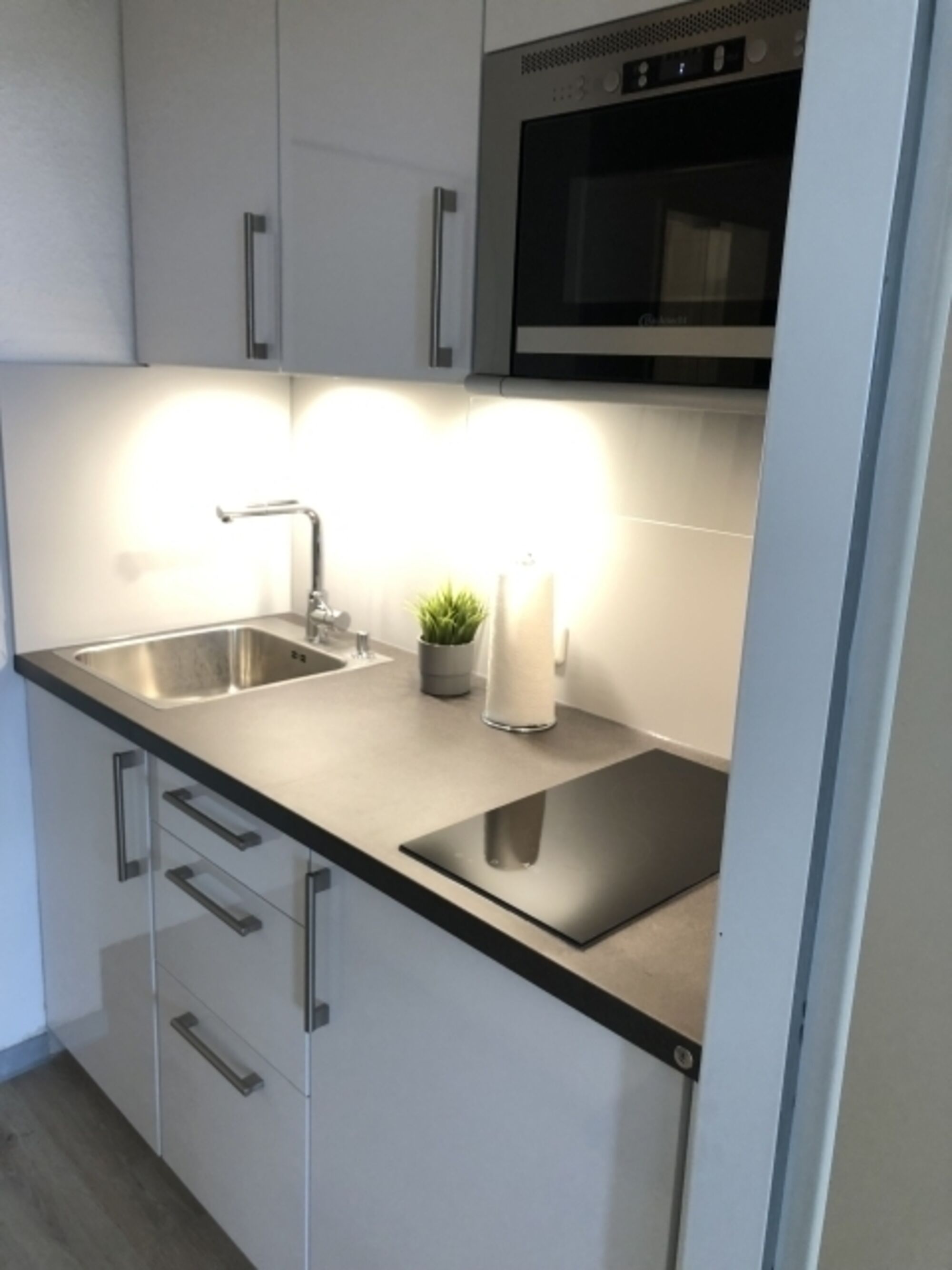 Die moderne Küchenzeile ist mit einem Herd mit Cerankochfeld, einer Mikrowelle mit Grillfunktion und einem Kühlschrank ausgestattet. Eine Kaffeemaschine, ein Wasserkocher sowie ein Toaster sind ebenfalls vorhanden.