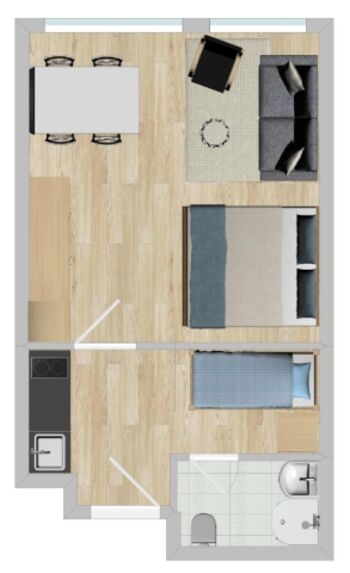 Die helle und renovierte 1-Zimmer-Wohnung Lieblingsplatz ist 29 qm groß, befindet sich im 1. OG (Aufzug vorhanden) und bietet Platz für max. 4 Personen (2 Erwachsene, 2 Kinder.)