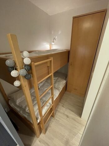 In der Schlafnische befindet sich ein Etagenbett und ein weiterer Kleiderschrank.