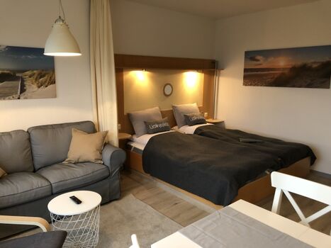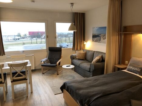 Genießen Sie den herrlichen Ausblick auf den Yachthafen von Burgtiefe aus dem gemütlich eingerichteten Wohn-/Schlafbereich der Wohnung. Dieser verfügt über ein Doppelbett (1,80x2,00 m), einen großen Kleiderschrank, einen Esstisch sowie eine Sofa-Ecke mit TV.