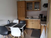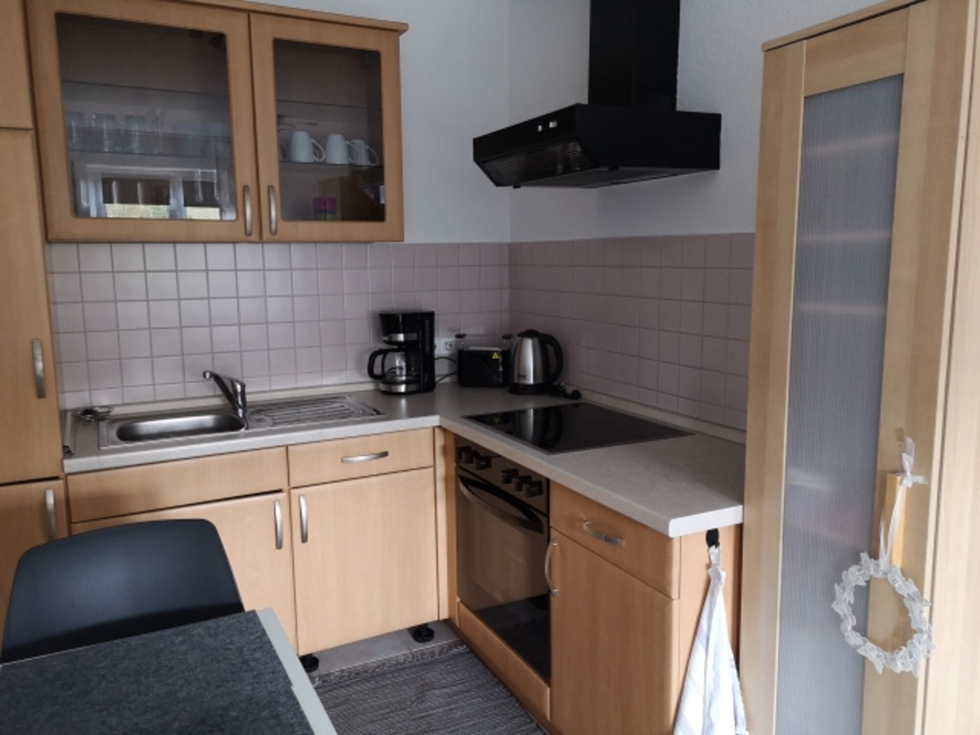 Cerankochfeld, Dunstabzugshaube, Kühlschrank mit Gefrierfach, Senseo-Kaffeeautomat, Korkenzieher / Flaschenöffner, Gewürze (Salz, Pfeffer, Zucker), Geschirrhandtücher, Mülltüten, Essplatz in der Küche