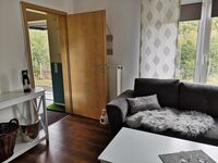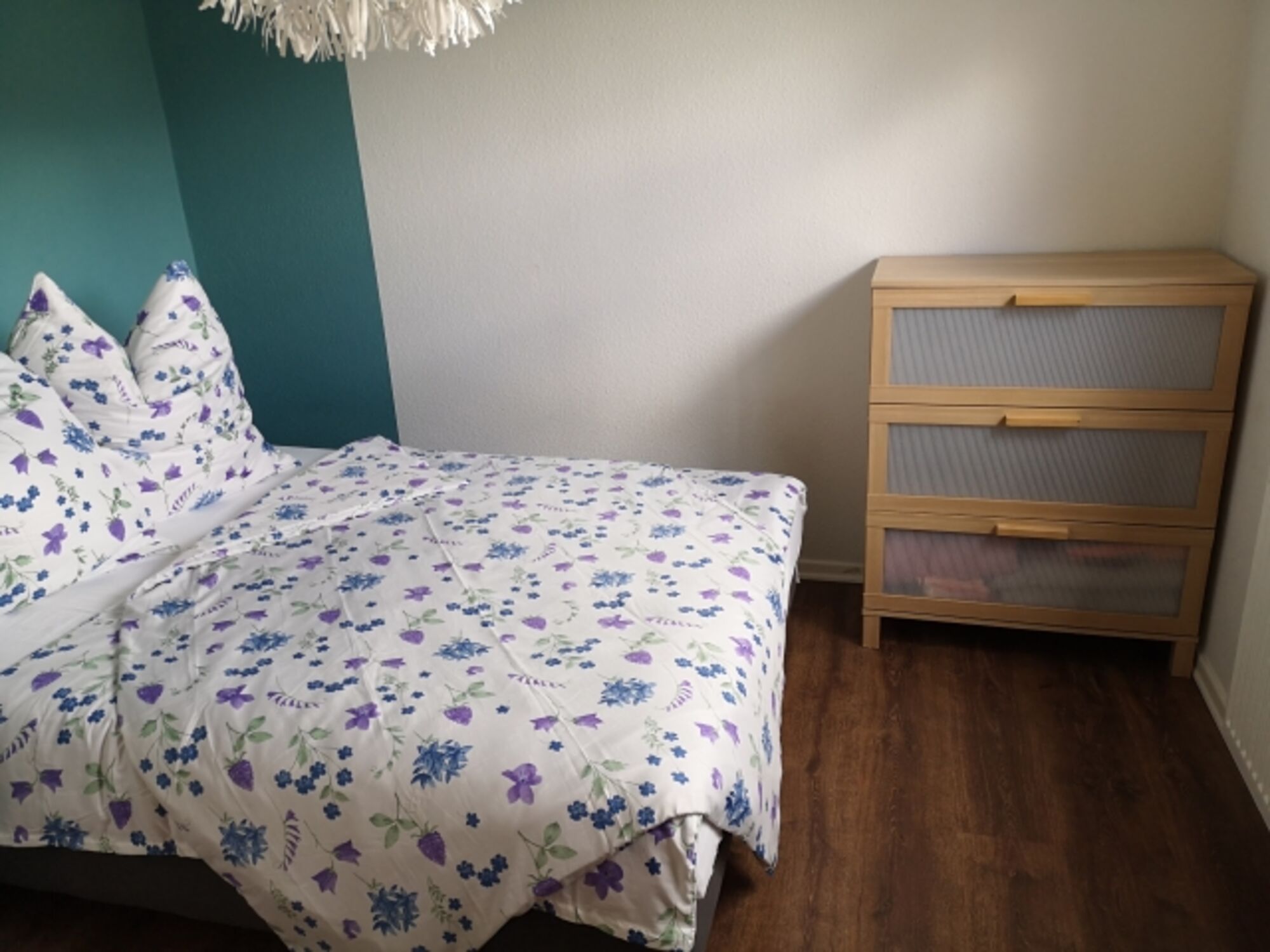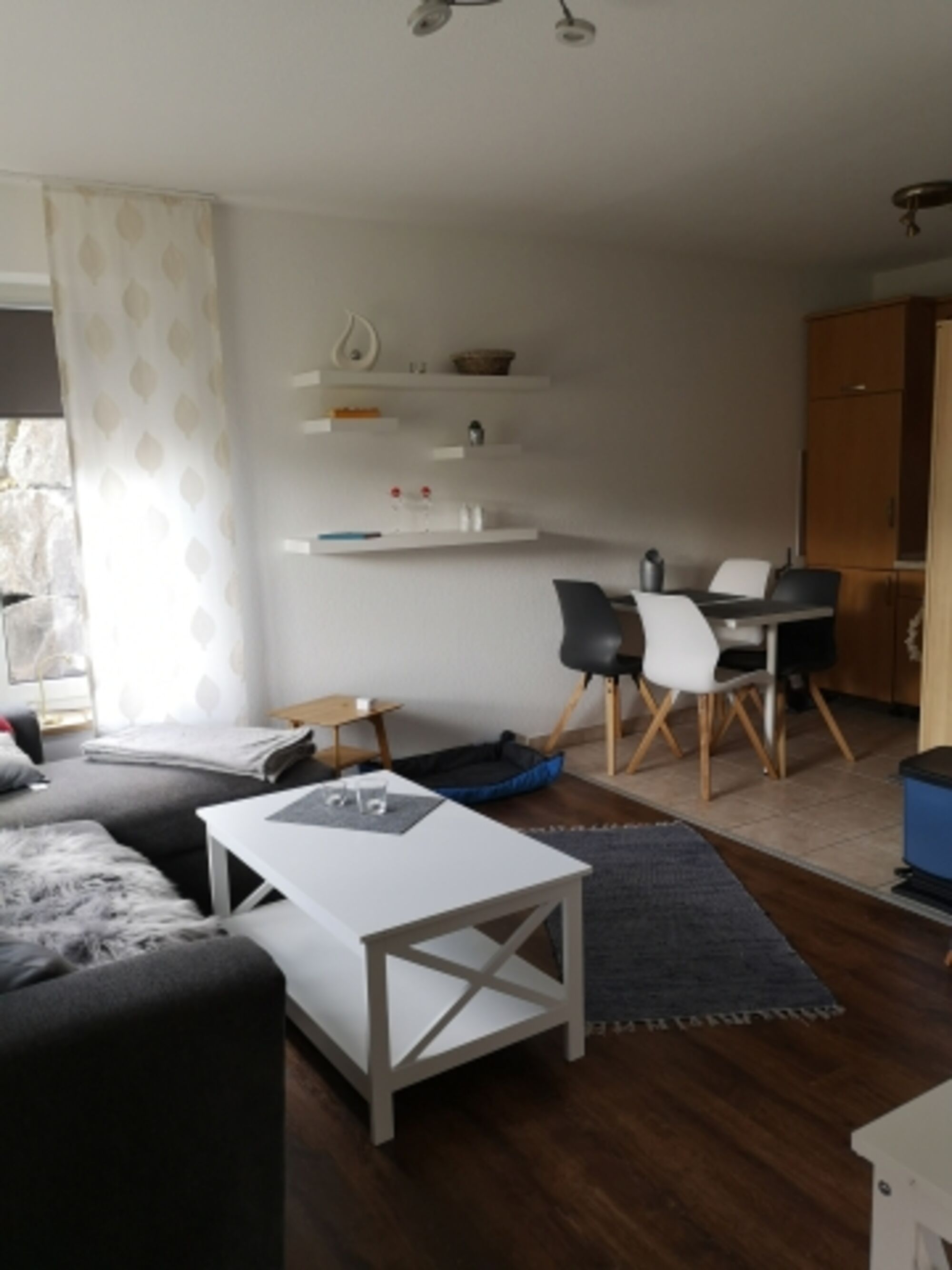 Die Wohnküche ist hell und freundlich. Bis zu 4 Personen können bei uns übernachten. Jeweils 2 im Schlafzimmer und 2 im Wohnzimmer auf dem ausziehbaren Sofa. Bettwäsche und Handtücher sind vorhanden.