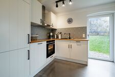 Cerankochfeld, Dunstabzugshaube, Gefrierschrank, Korkenzieher / Flaschenöffner, Geschirrhandtücher, Essplatz in der Küche