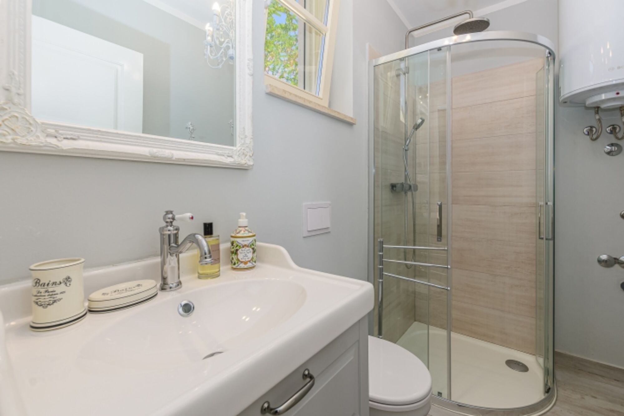 Waschbecken, Spiegel, Fenster im Bad, Bidet