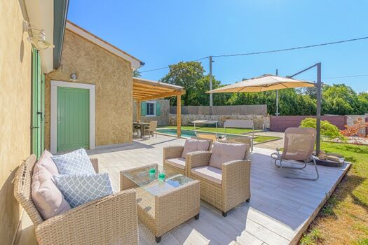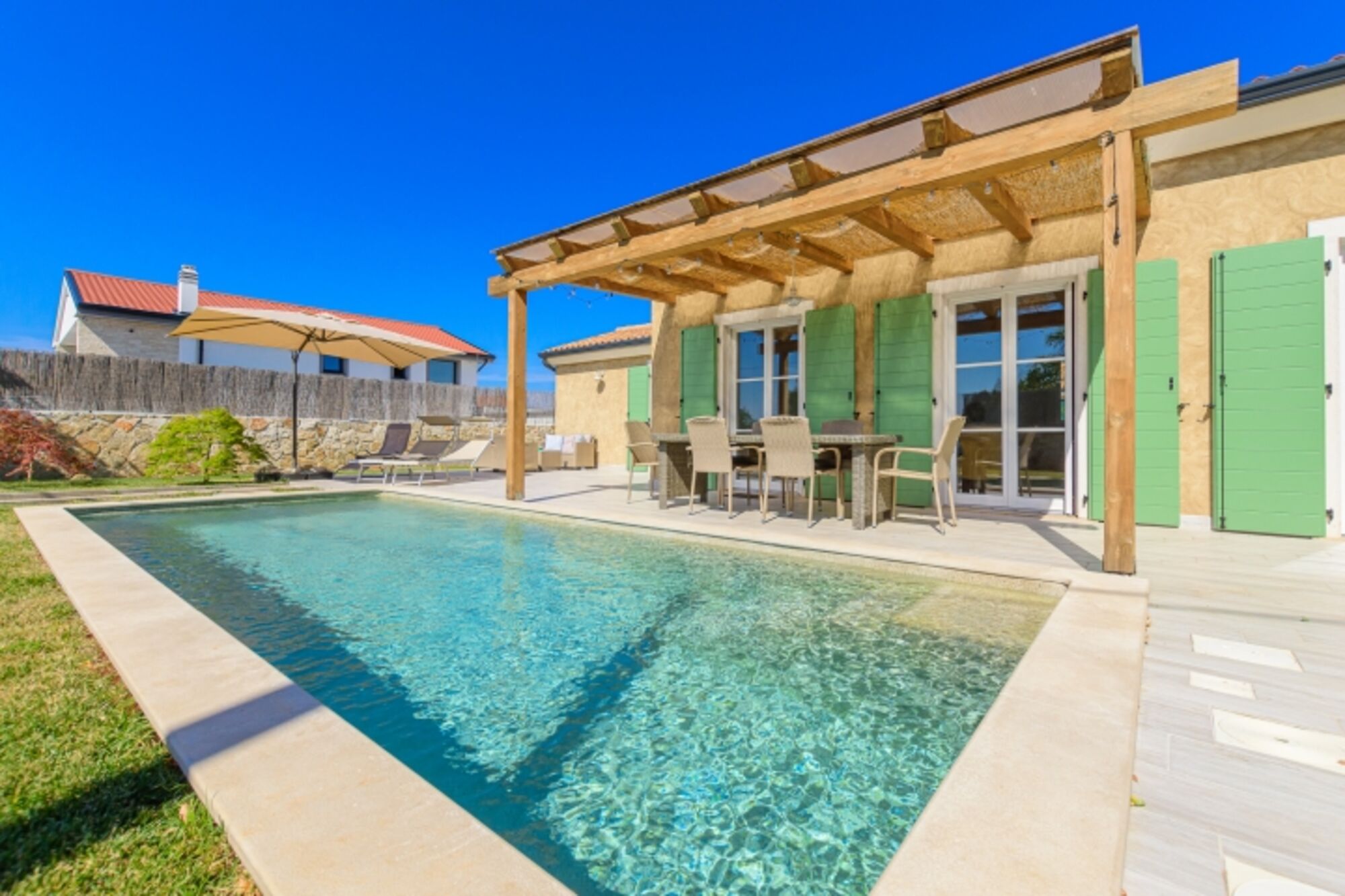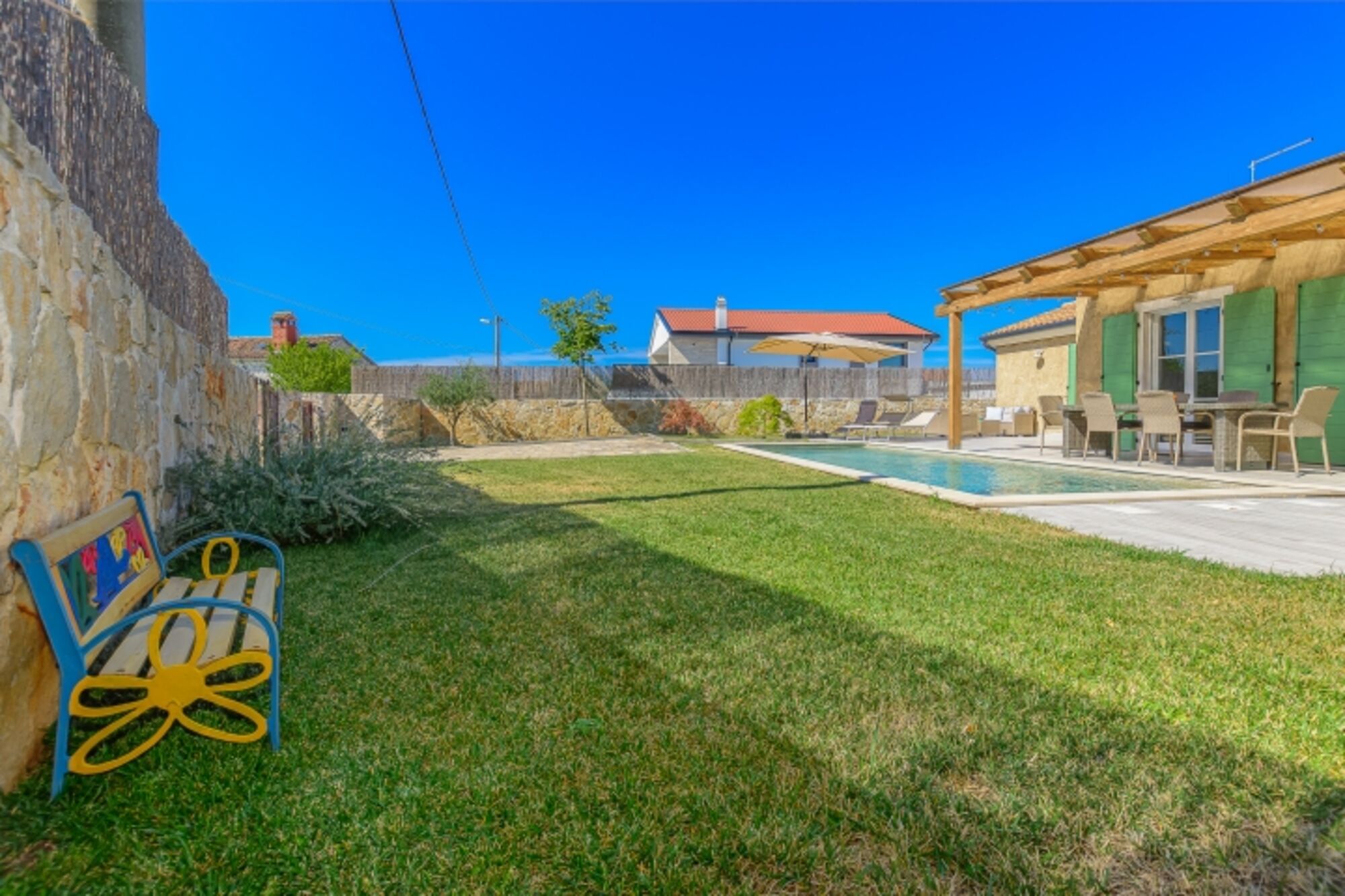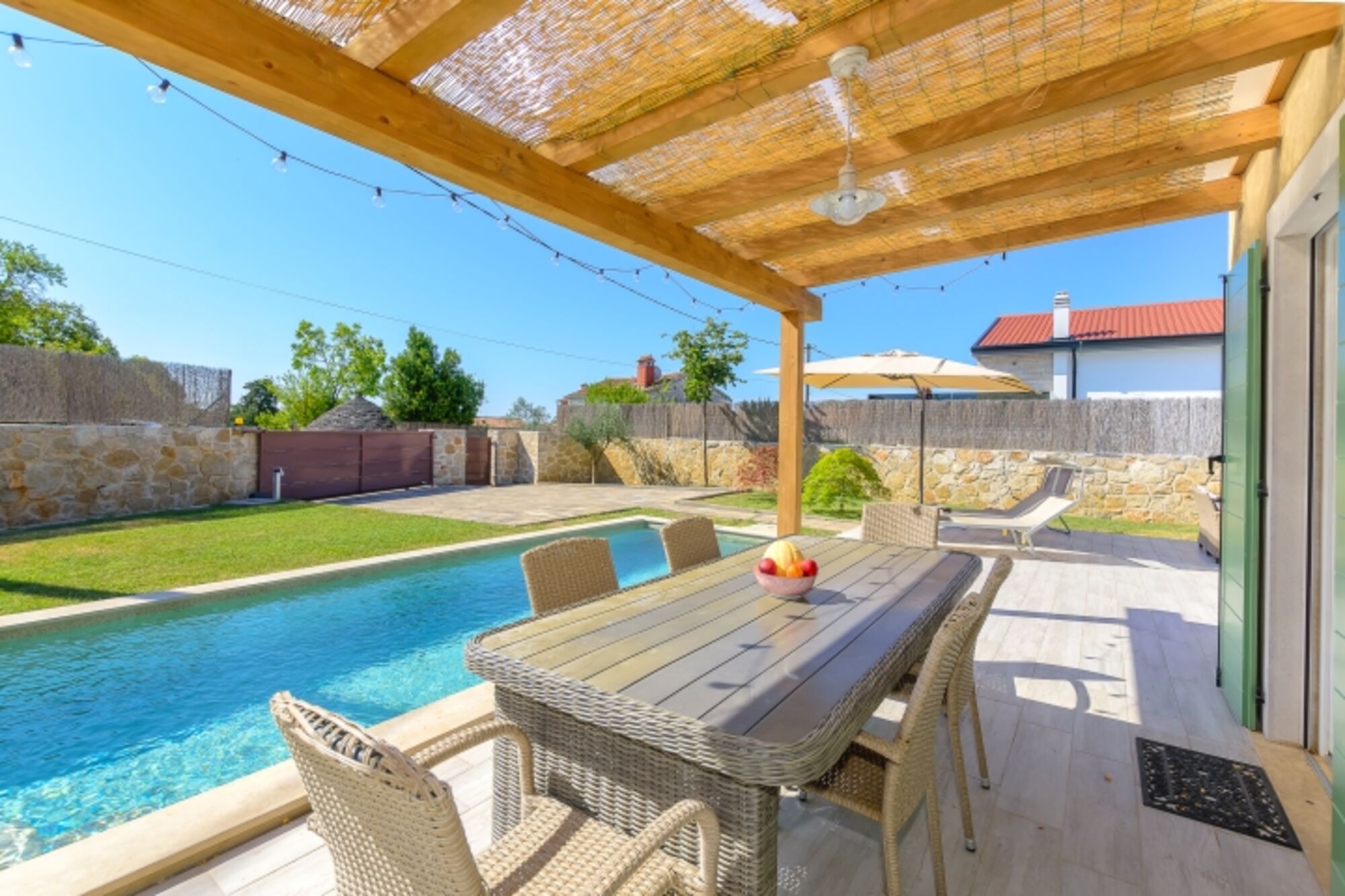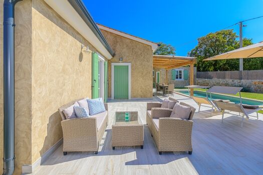 Im Innenhof der Villa gibt es einen Swimmingpool, eine Terrasse, einen Grill, Liegestühle und Gartenmöbel. Der Hof ist komplett eingezäunt und Sie können sich entspannen und den Charme Istriens und die Schönheit der Villa genießen.