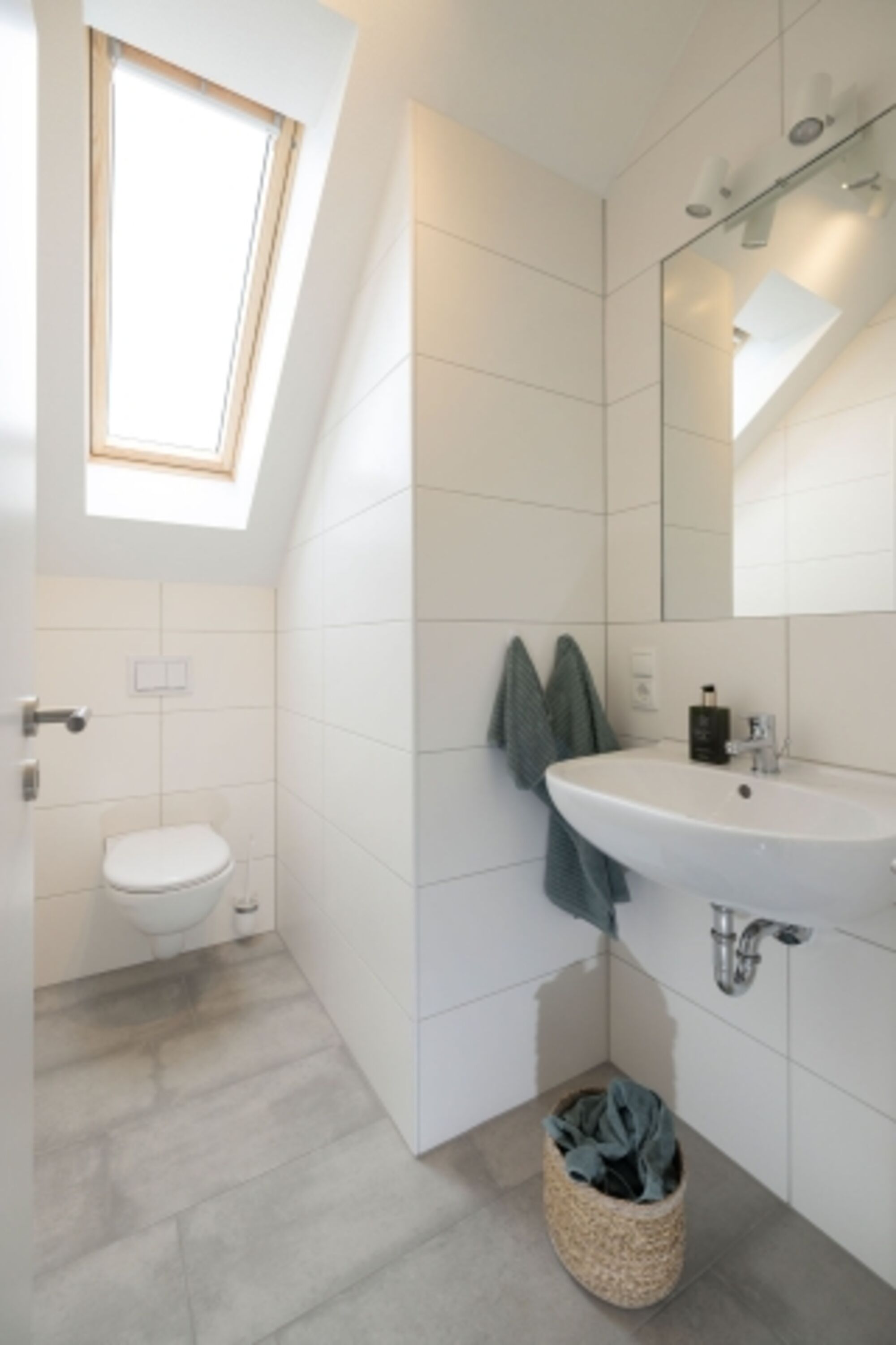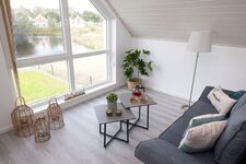 Im Obergeschoss befinden sich die zwei Schlafzimmer und ein Gäste WC. Die offene Galerie läd ebenfalls mit einem Sofa zum Entspannen ein. Von hier aus haben Sie einen tollen Blick auf die Garten- und Wasserlandschaft.