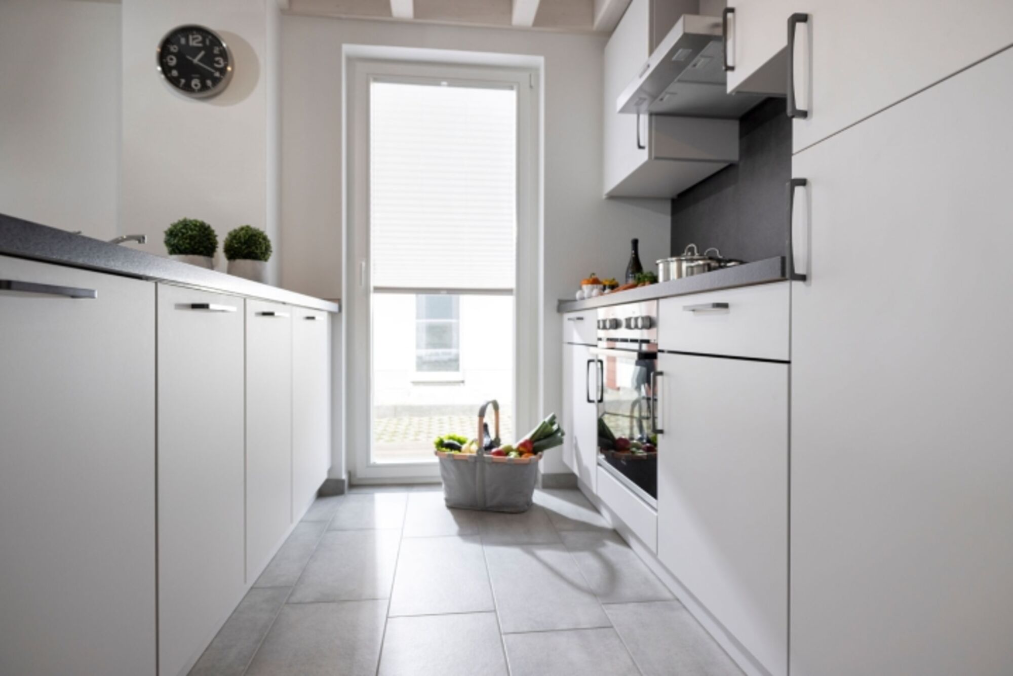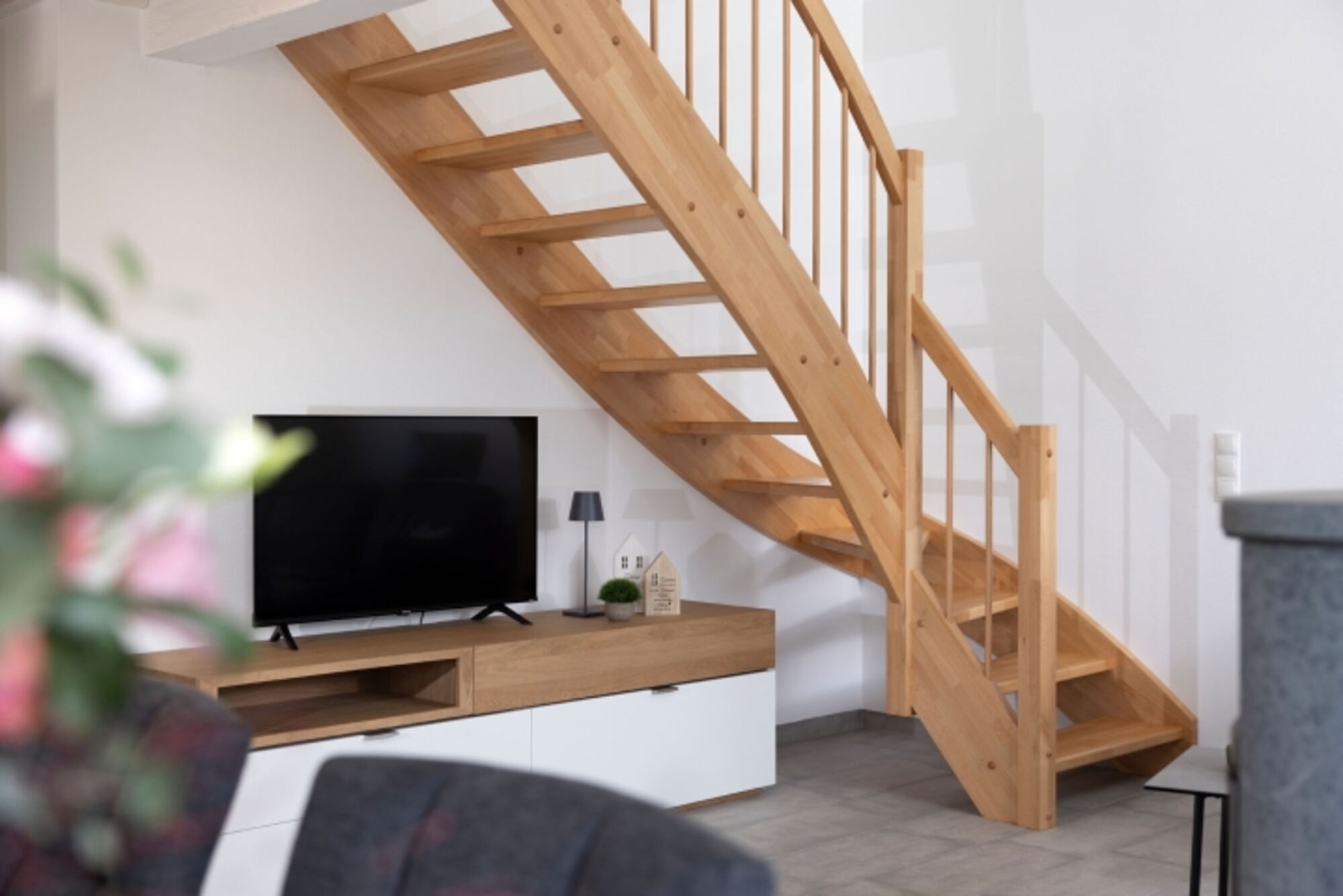 Es gibt im Erdgeschoss einen hellen Wohnbereich mit einer integrierten Essecke und einen gut ausgestatteten, großzügigen Küchenbereich. Ein Kinderstuhl ist vorhanden.