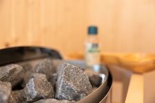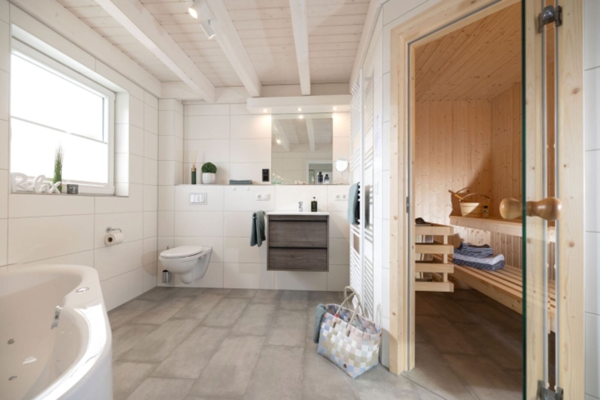 Das Badezimmer im Erdgeschoss mit Dusche, Sauna und Wirlpool verspricht viel Erholung und gleicht einer kleinen Wellness-Oase. Hier wärmt ein Handtuchheizkörper.