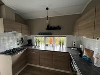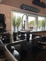 4-Platten Herd, Gasofen / Gasherd, Dunstabzugshaube, Kühlschrank mit Gefrierfach, Senseo-Kaffeeautomat, Mixer, Korkenzieher / Flaschenöffner, Gewürze (Salz, Pfeffer, Zucker), Geschirrhandtücher