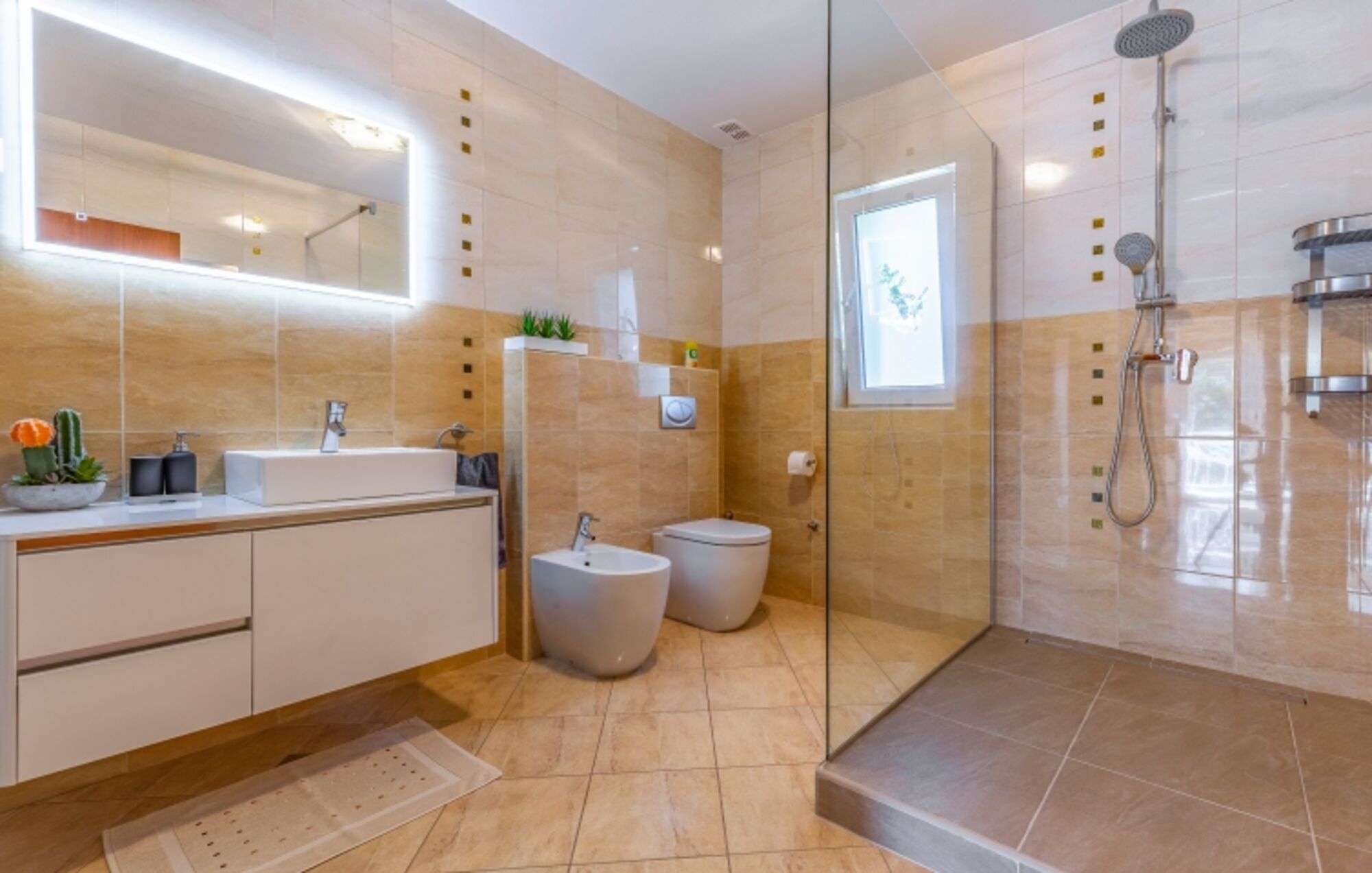 Waschbecken, Spiegel, Fenster im Bad, Bidet