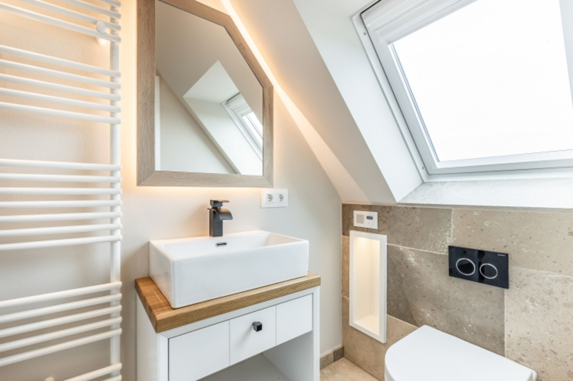 und Waschtische vom Tischler maßgefertigt. Ebenfalls wurde die Küche vom Tischler nach individuellen