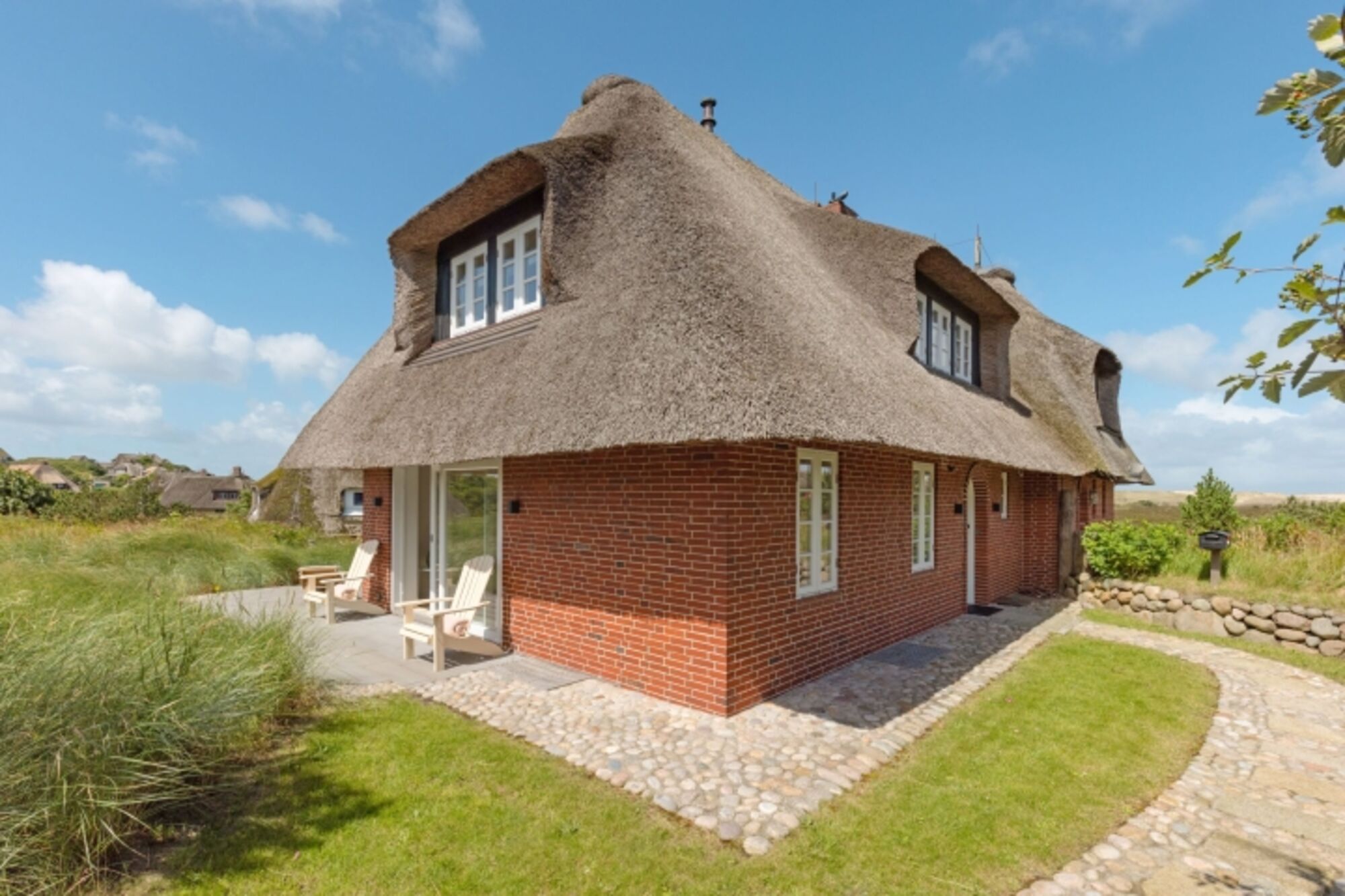 Modernes Ferienreihenhaus unter Reet mit Kamin und großem Garten
