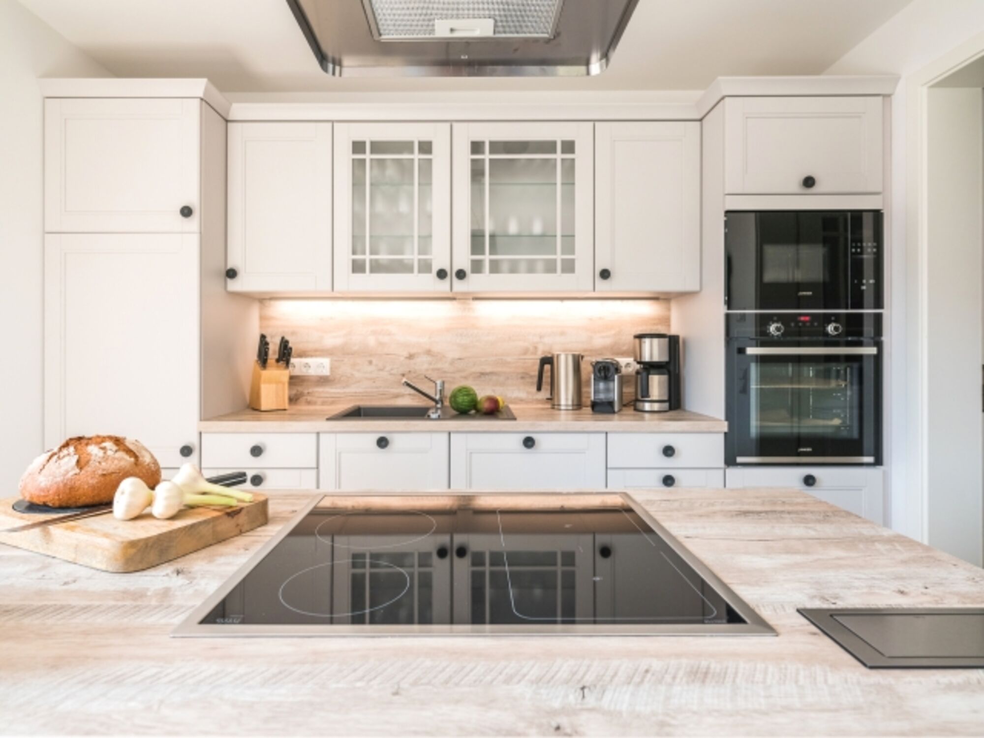 Cerankochfeld, Dunstabzugshaube, Kühlschrank mit Gefrierfach, Nespresso-Automat, Eierkocher, Mixer