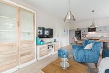 Im Wohnraum mit offener Küchenzeile finden Sie bequeme Sitzmöbel, Flat-TV und einen großzügigen Esstisch der zum Verweilen einlädt. Von hier aus haben Sie Zugang zur West-Terrasse, auch hier ist eine gemütliche Sitzgarnitur vorhanden. Die Küche ist mit sämtlichen Küchengeräten und allen gängigen Utensilien komplett ausgestattet.