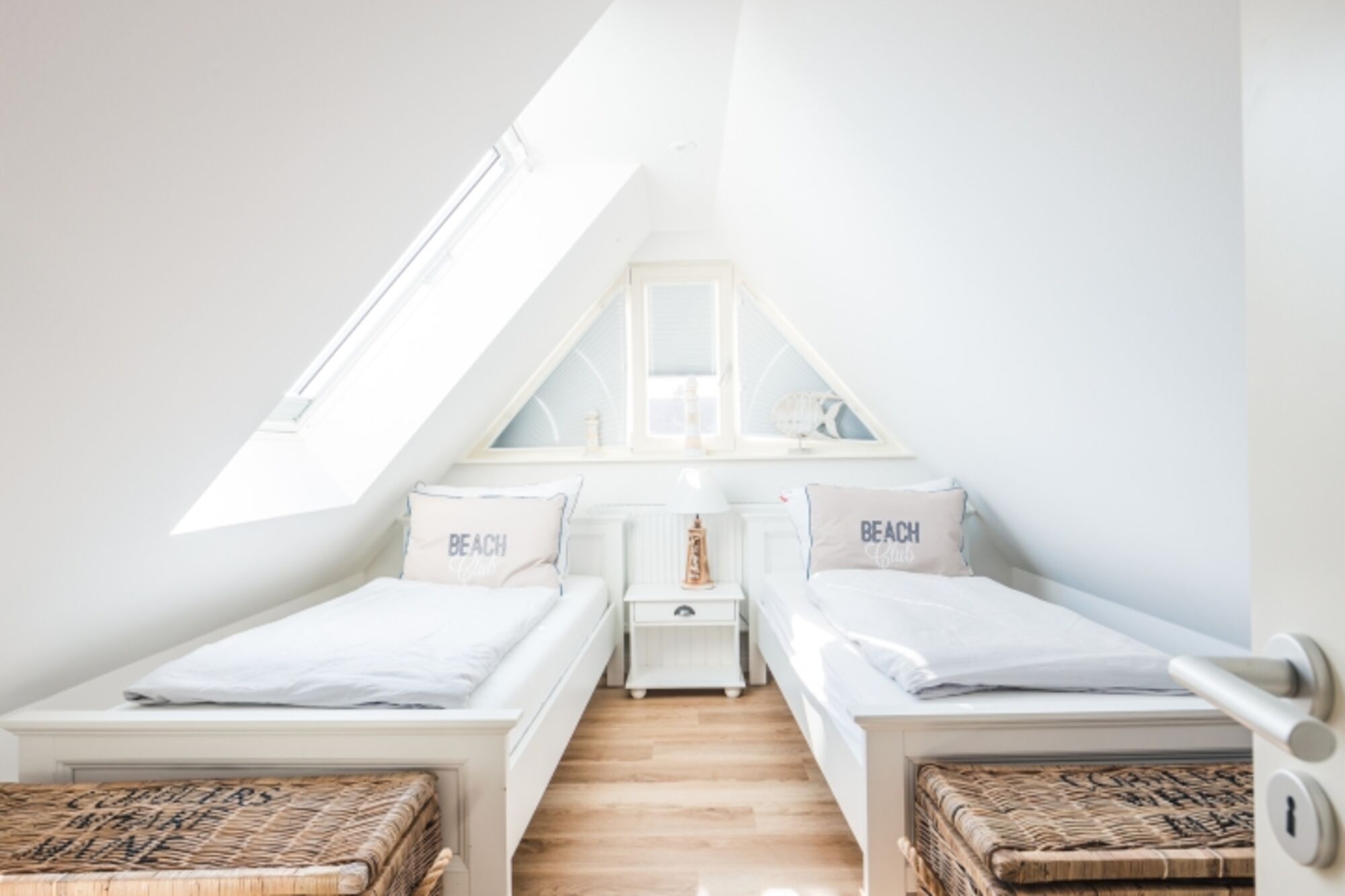 Im Obergeschoss des Ferienhauses befinden sich zwei Schlafzimmer für je zwei Personen, eines der Hauptschlafzimmer hat Zugang zu einem separaten weiteren kleinen Zimmer mit Einzelbett. Die Schlafzimmer sind mit Boxspringbetten ausgestattet. Der ausgebaute Spitzboden verfügt über zwei weitere Einzelbetten. 3 von 4 Schlafzimmern verfügen über einen Flatscreen TV.