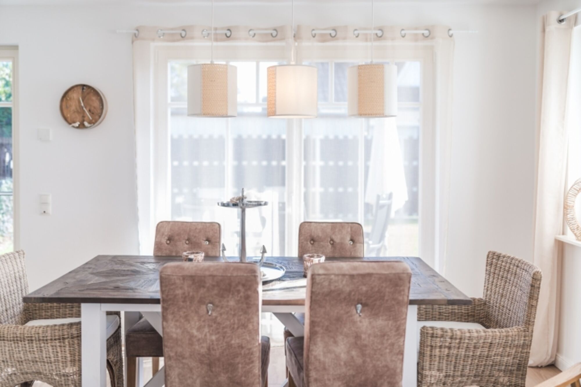 Im Erdgeschoss des Ferienhauses befindet sich der lichtdurchflutete und großzügig gestaltete Wohn- und Essbereich. Während die offene Küche mit hochwertiger Ausstattung keine Wünsche offen lässt, lassen sich am Esstisch für sieben Personen Urlaubsmahlzeiten genießen. Von hier aus fällt der Blick über große Fensterfronten auf die anliegende Terrasse die traumhafte Sonnenstunden verspricht. Ob gemütliche Abende oder romantisches Candle Light Dinner – unvergessliche Urlaubsmomente sind hier garantiert. Die komfortable Sitzlandschaft des Wohnbereichs vorm Kaminofen lädt zum Verweilen ein.Ebenfalls sorgt im Erdgeschoss ein Bad mit Dusche für zusätzlichen Komfort. Natürliche Materialien, dezente Formen und abgestimmte Farben machen den Charme dieses Ferienhauses aus – Ankommen-Wohlfühlen und Durchatmen garantiert.