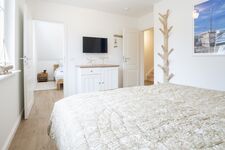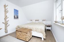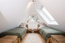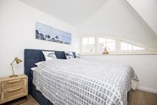 Im Obergeschoss des Ferienhauses befinden sich zwei Schlafzimmer für je zwei Personen. Eines der Hauptschlafzimmer hat Zugang zu einem separaten kleinen Zimmer mit Einzelbett. Die Schlafzimmer sind mit Boxspringbetten ausgestattet. Der ausgebaute Spitzboden verfügt über zwei weitere Einzelbetten. Drei von vier Schlafzimmern verfügen über einen Flatscreen-TV.