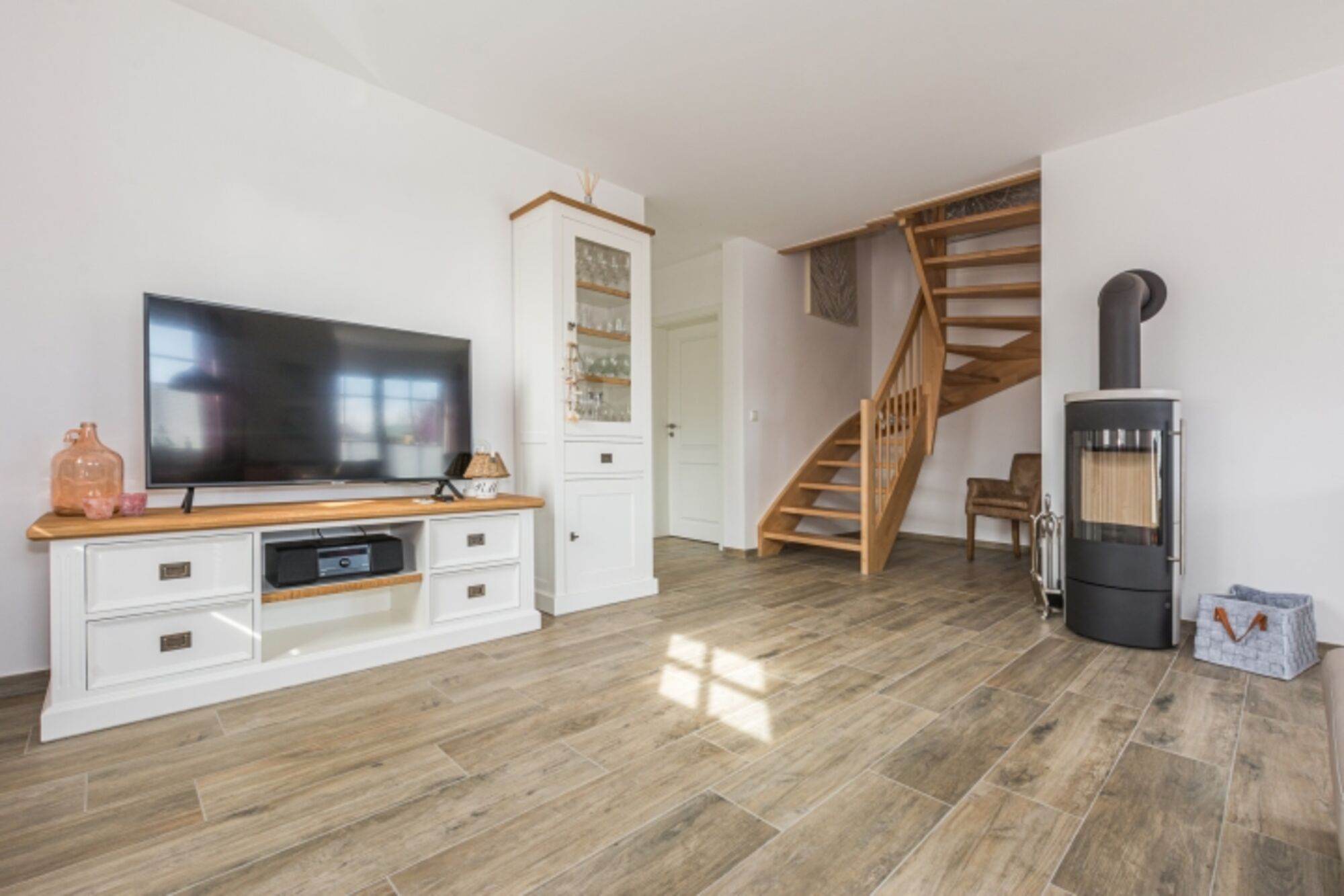Im Erdgeschoss des Hauses erwartet sie ein offener Wohnbereich mit Kamin, integrierter Küche und gemütlichem Essbereich. Die Küche ist voll ausgestattet und lässt keine Wünsche offen.