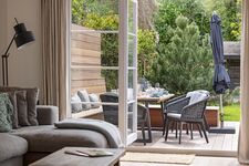 Verweilen Sie im Sommer auf der fast 60 m² großen Terrasse mit exklusiven Gartenmöbeln, oder im Garten in der Hängematte.