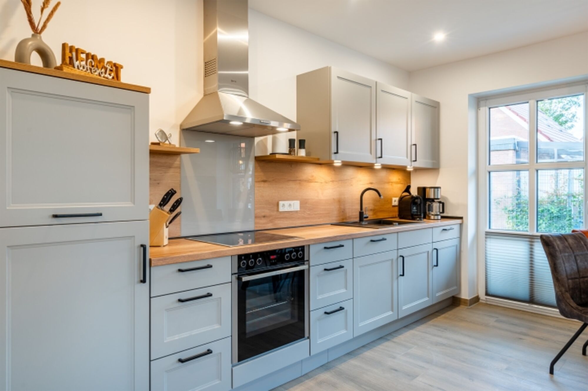 Cerankochfeld, Dunstabzugshaube, Kühlschrank mit Gefrierfach, Korkenzieher / Flaschenöffner, Essplatz in der Küche