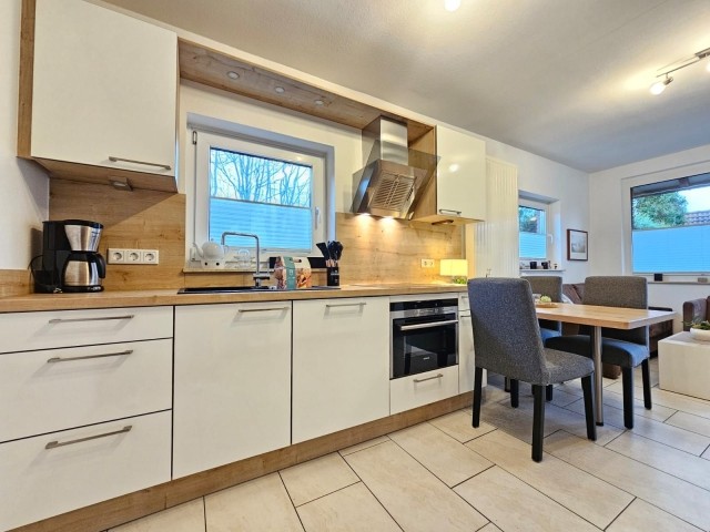 Die Ferienwohnung Boppo verfügt über einen hellen, offenen Wohnbereich mit Wohnküche, der modern und vollständig ausgestattet ist. Für eine unkomplizierte Selbstversorgung stehen Ihnen Ceranfeld, Backofen, Kühlschrank mit Gefrierfach, Kaffeemaschine, Wasserkocher, Toaster sowie umfangreiche Küchenutensilien zur Verfügung.