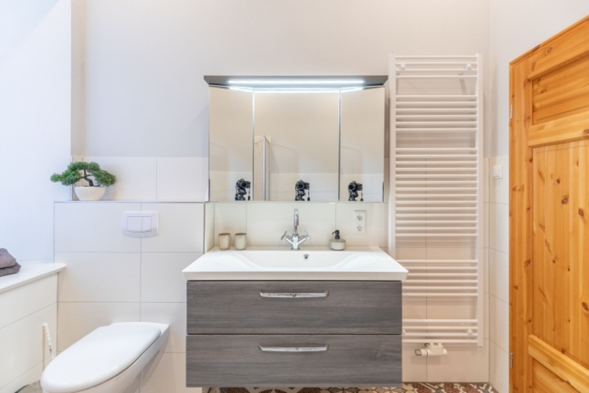 Das Badezimmer mit ebenerdiger Regendusche, WC, Handtuchwärmer und Waschmaschine rundet das Bild ab.