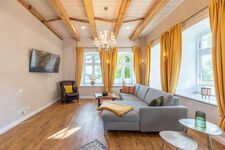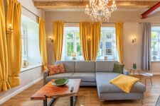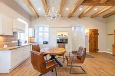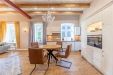 Die ca. 100 qm große Ferienwohnung im Erdgeschoss ist modern und exklusiv eingerichtet. Das Wohnzimmer ist mit einer großen Wohnlandschaft mit Schlaffunktion (160 x 200), Ledersessel, Smart-TV (Sat) und Bluetooth-Soundsystem ausgestattet. Am Esstisch finden bis zu 4 Personen Platz. Die moderne, offene Küche ist mit Cerankochfeld, Backofen, Mikrowelle, Geschirrspüler und Kühl-Gefrierkombination ausgestattet. Vor dem Wohnzimmer befinden sich die möblierte Südterrasse und der hundesicher eingezäunte Garten.