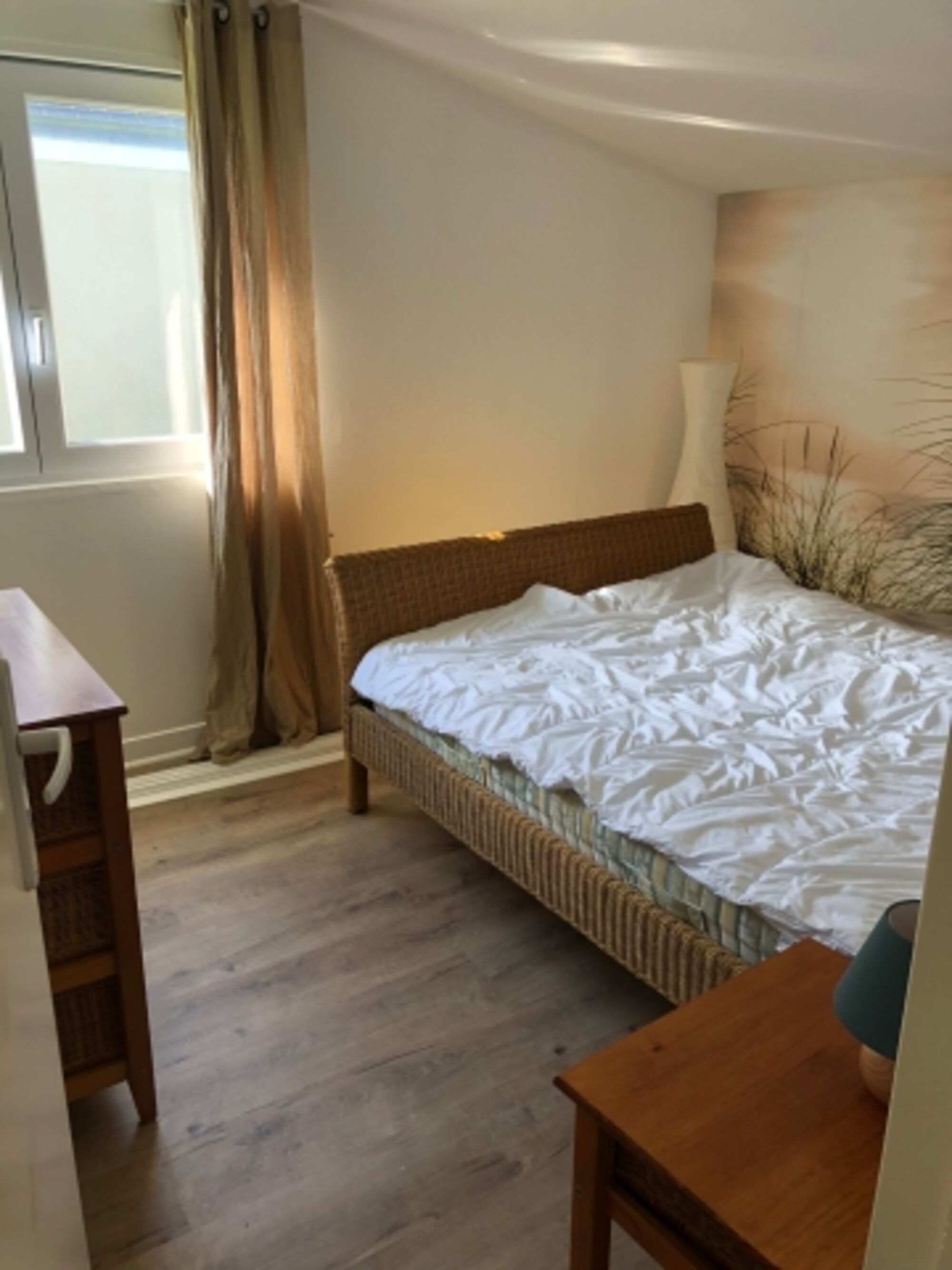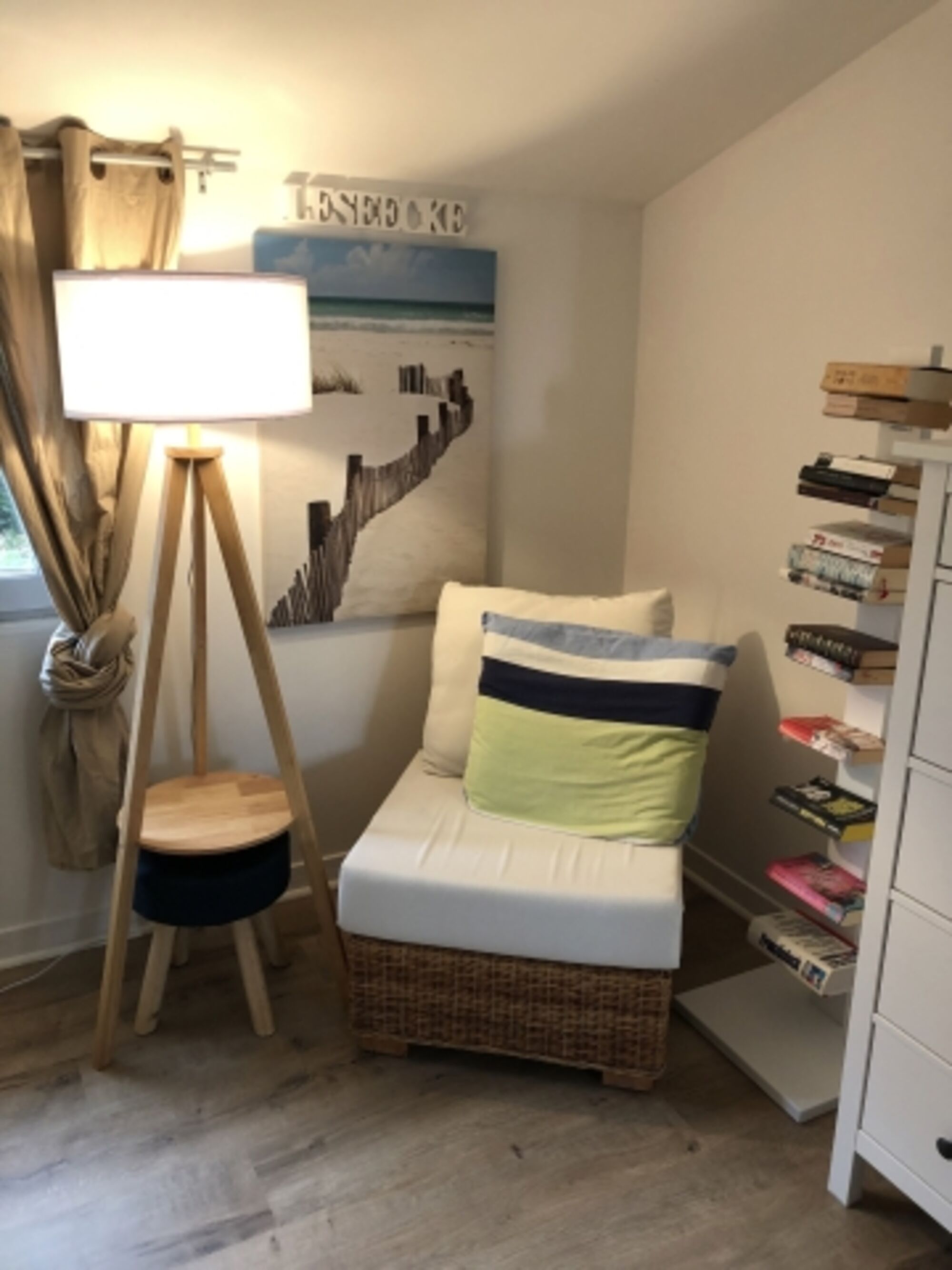 Zwischen den Schlafzimmern liegt ein Ankleidezimmer (rund 11 Quadratmeter) mit offener Garderobe, großer Kommode, Spiegel und gemütlicher Leseecke (samt Bücherturm). Doppelbett 1,40 x 2,00m, Kommode, Leselampe am Bett