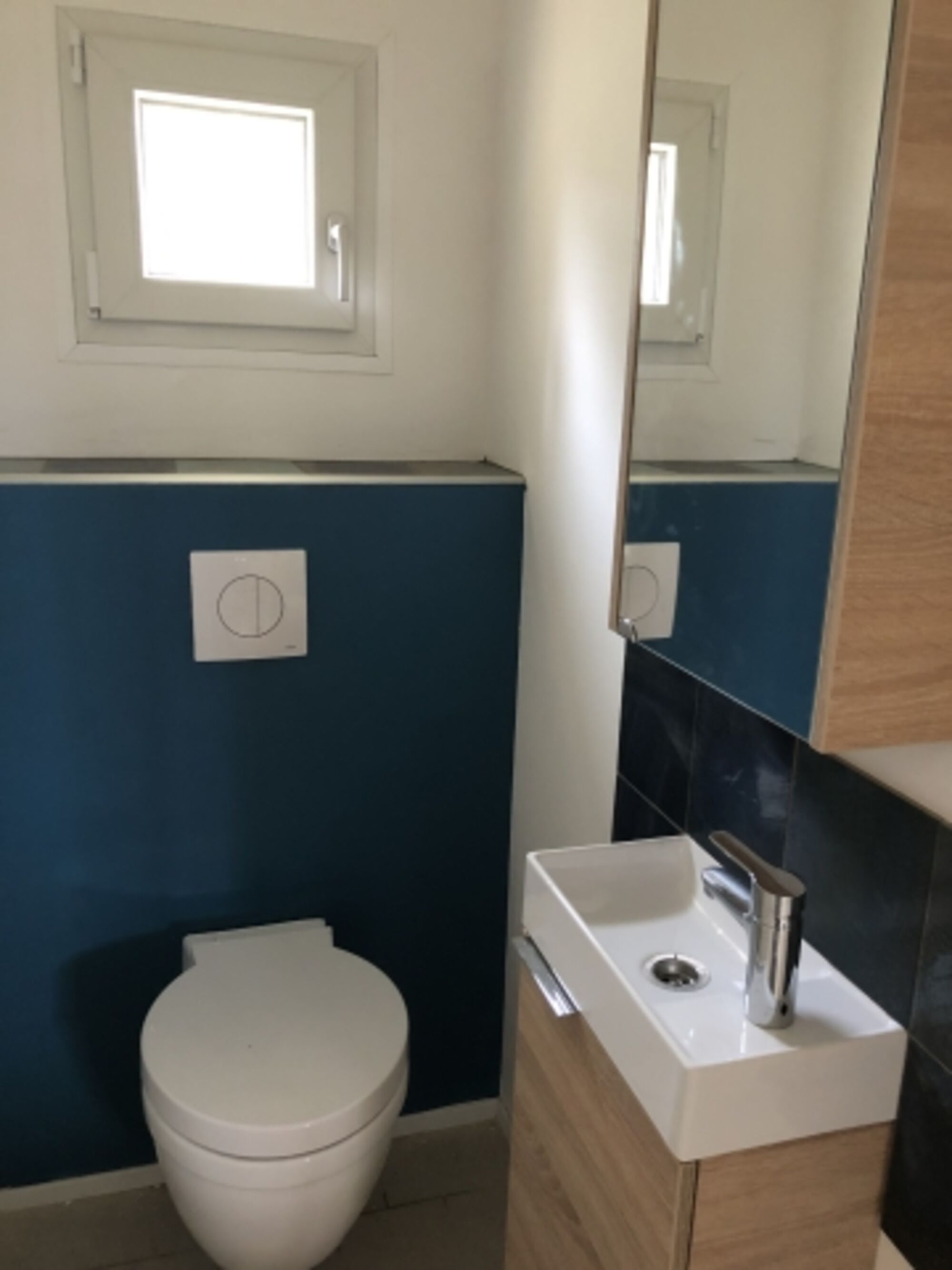Waschbecken, Spiegel, Fenster im Bad