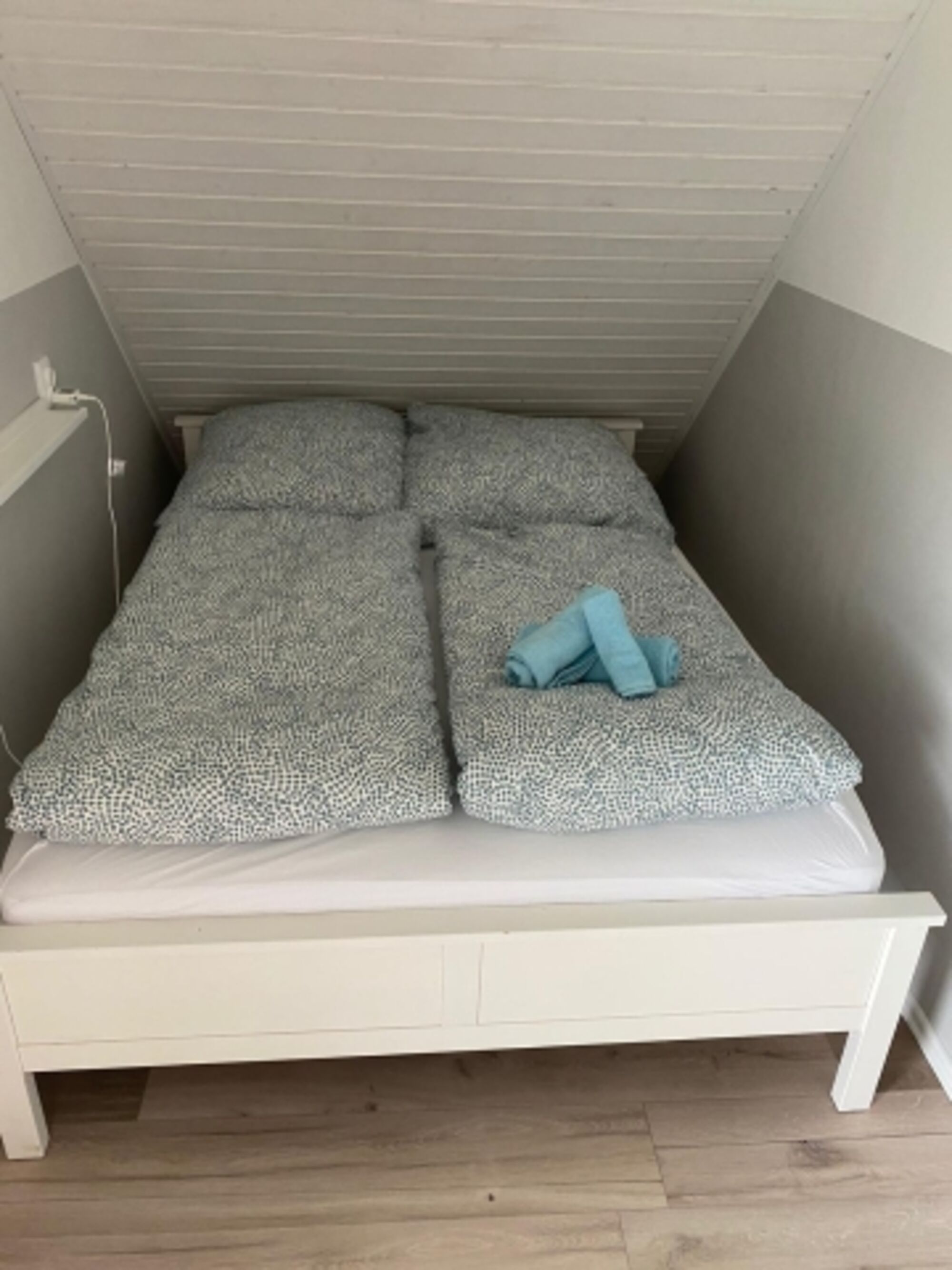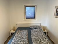 Im rechten Schlafzimmer steht ein Doppelbett und eine Kommode.
