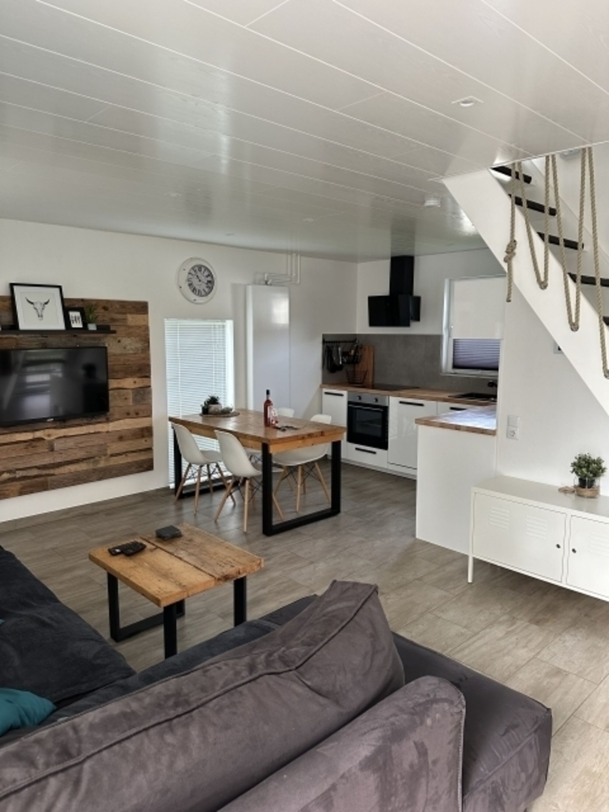 Im Erdgeschoss befindet sich der große gemütliche eingerichtete Wohnbereich mit angrenzender offener Küche und Essecke. Ein Schlafzimmer mit Doppelbett und das Badzimmer sind im Erdgeschoss vorhanden.