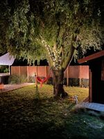 Im Garten gibt es verschiedene Sitzmöglichkeiten die zum Verweilen einladen. Gartenmöbel, Sonnenschirm und ein Grill runden das Angebot ab. Angrenzend an die überdachte Terrasse steht der große Jacuzzi.