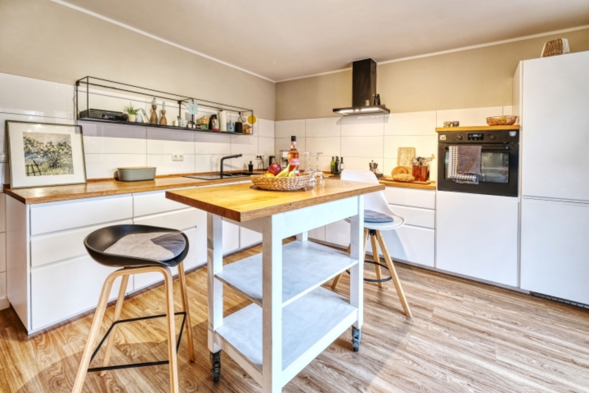 Gasofen / Gasherd, Dunstabzugshaube, Kühlschrank mit Gefrierfach, Mixer, Korkenzieher / Flaschenöffner, Gewürze (Salz, Pfeffer, Zucker), Geschirrhandtücher, Essplatz in der Küche
