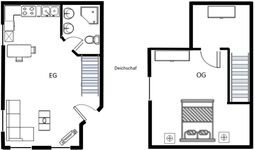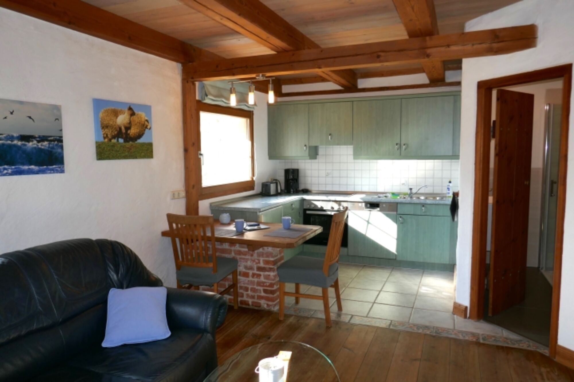 Die helle und freundliche Ferienwohnung Deichschaf bietet entspannte Urlaubsmöglichkeiten für 2 Personen und zwei Hunde. Der schöne Wohnbereich mit offener Küche bietet viel Platz für einen entspannten Urlaub. Das geräumige Schlafzimmer mit Doppelbett und einem Babybett erreicht man über eine Holztreppe. In 2022 hat die Ferienwohnung ein ganz neues Bad bekommen.